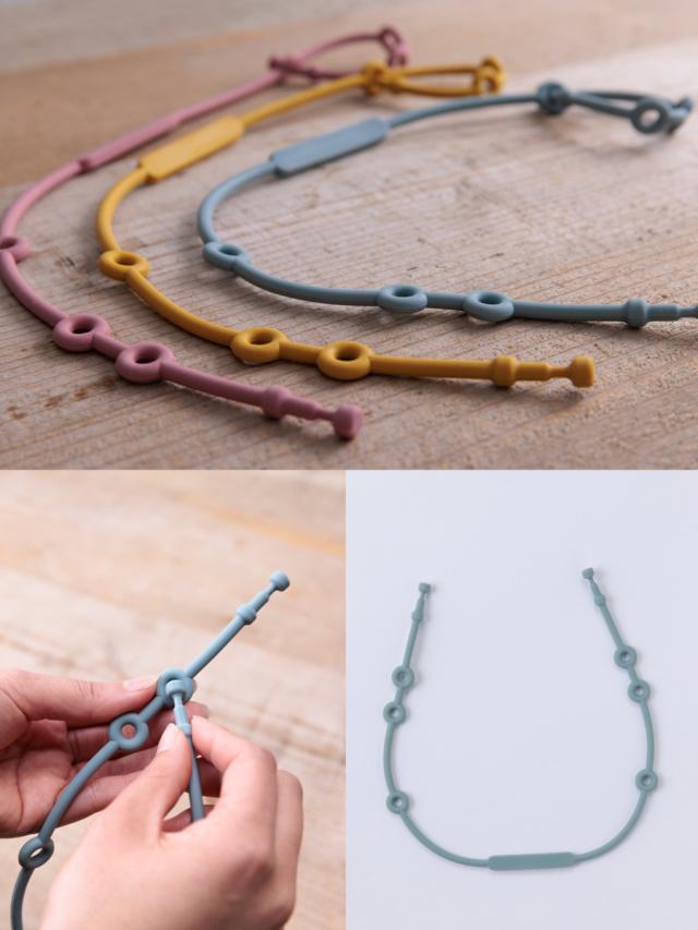 シリコンストラップは6ヶ所のサイズ調節穴付きです。サイズ調節できるので、マグやおもちゃなどをベビーカーに取り付けできます。先端の留め部分は大きめになっており、簡単に付け外しできます。水洗いもできるから衛生的です。