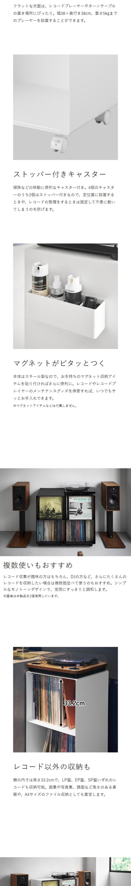 ディスプレイ収納もできる レコード専用ラック 『 tower( タワー )レコードラック 』は、お気に入りのレコードをたっぷり収納できる2段ラック。丈夫なスチール製で、LPレコードを最大160枚収納できます。棚の前面には溝があり、レコードジャケットを立ててディスプレイできるのが◎。天板には5kgまでのレコードプレーヤーを設置OK。移動に便利なキャスター付きで、インテリアになじむスタイリッシュなモノトーンデザインも魅力。A4ファイルの収納や、画集や譜面など高さのある書籍の本棚としてもおすすめです。