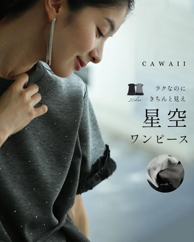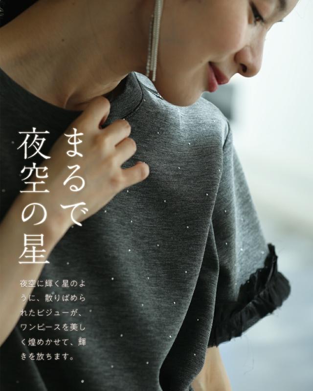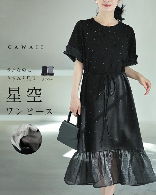 新作8月2日 ラクなのにきちんと見え 星空ワンピース cawaii w61505ps S~2L対応 春 夏 ブラック グレー 日常使い おでかけ 女子会 パーティー デート 食事会 シアー ラインストーン 装飾 ティアード レディース ファッション 大人 ママ ミセス 30代 40代 50代 60代