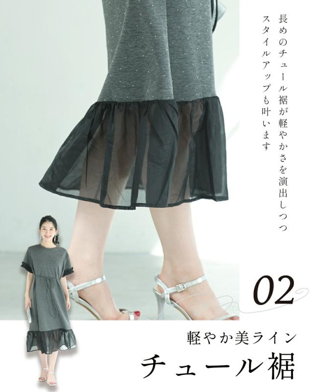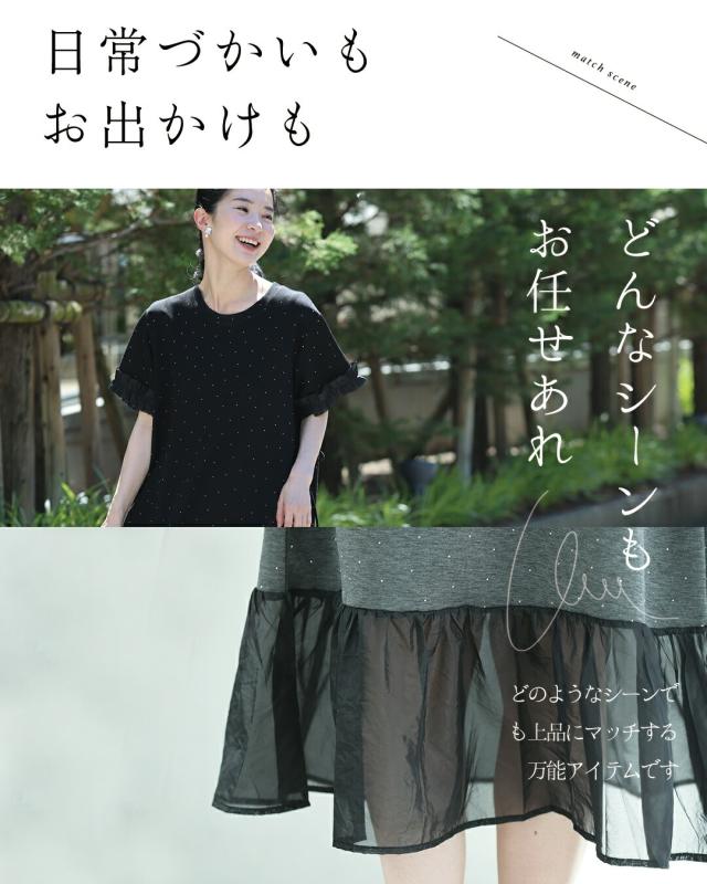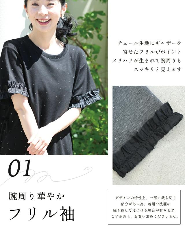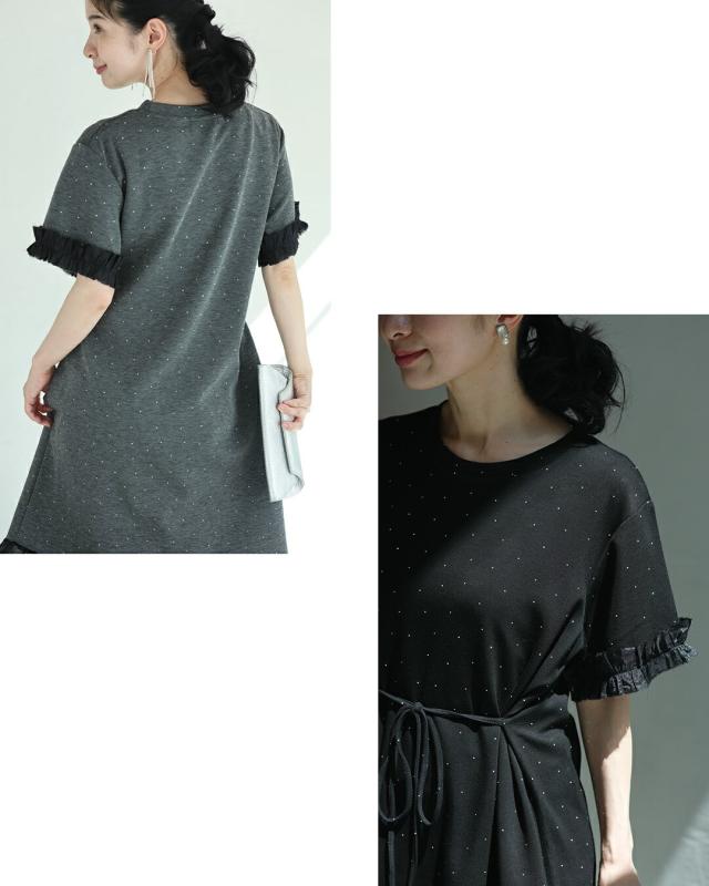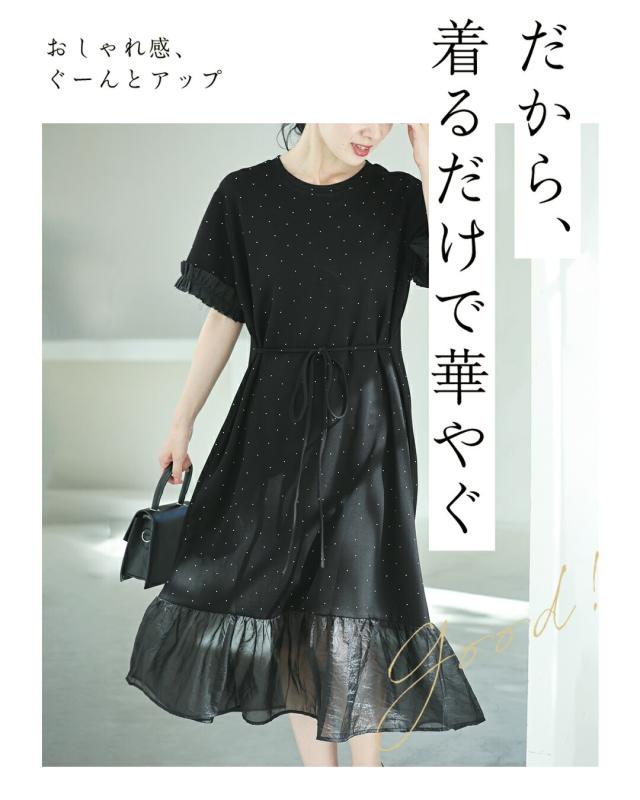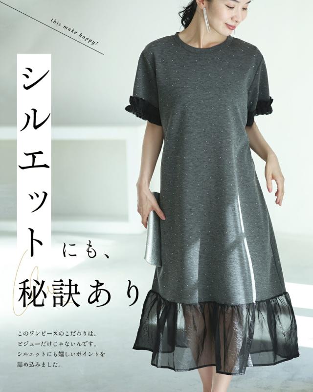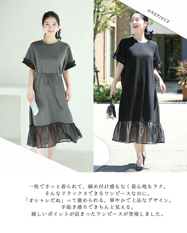 w61505ps 新作 新着 再入荷 CAWAII FRENCHPAVE フレンチパヴェ エレガント ベーシック カジュアル 可愛い かわいい カワイイ おしゃれ オシャレ お洒落 個性 個性的 定番 ベーシック 大人かわいい 大人可愛い 上品 女性らしい デザイン スタンダード ナチュラル きれいめ キレイめ シンプル フェミニン レディース レディースファッション 大人 ママ ミセス 30代 40代 50代 60代 ワンピース ひざ丈 半袖 S M L XL フリーサイズ フリー 小さめ 小さいサイズ 低身長 痩せ ほっそり 小柄 細身 標準サイズ 大きめシルエット 大きい 大きめ ビッグシルエット ゆったり F サイズ自由 薄手 涼感性 涼しい ずずしい 春 夏 春服 春物 夏服 夏物 大人女子 伸縮 ブラック 黒 グレー 灰 日常使い おでかけ 旅行 女子会 パーティー お呼ばれ 食事会 デート シアー ラインストーン 装飾 ティアード