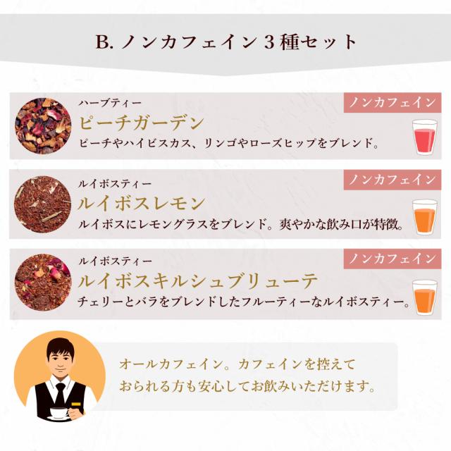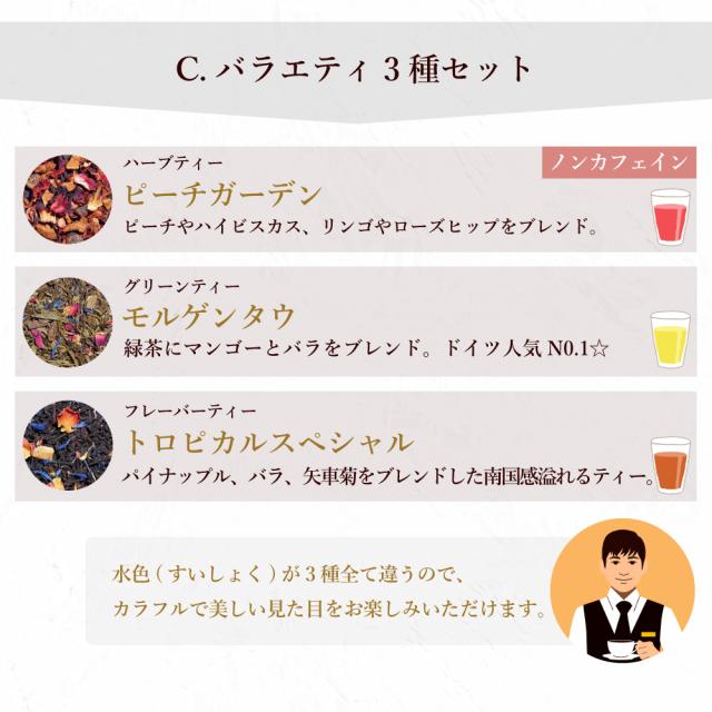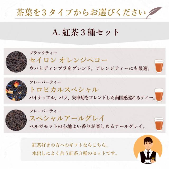 茶葉は、3タイプからお選びいただけますので、お相手様のお好みに合わせてお贈りいただけます。