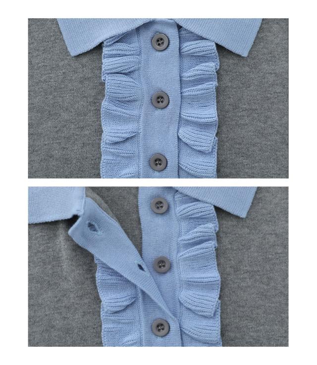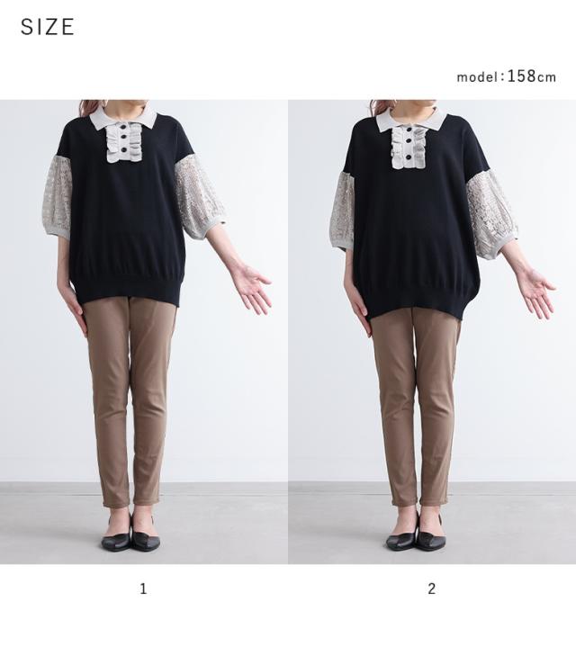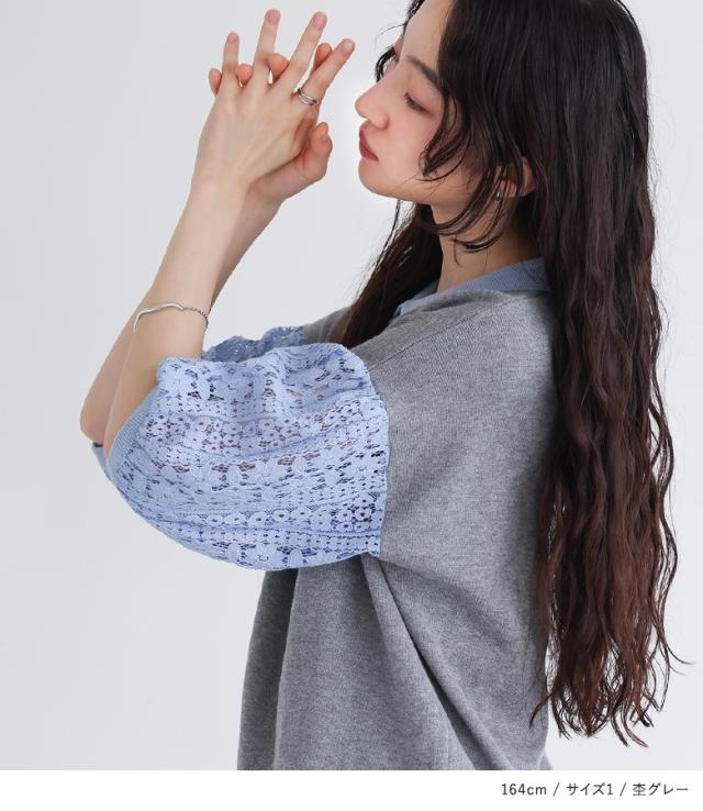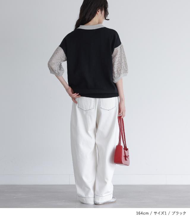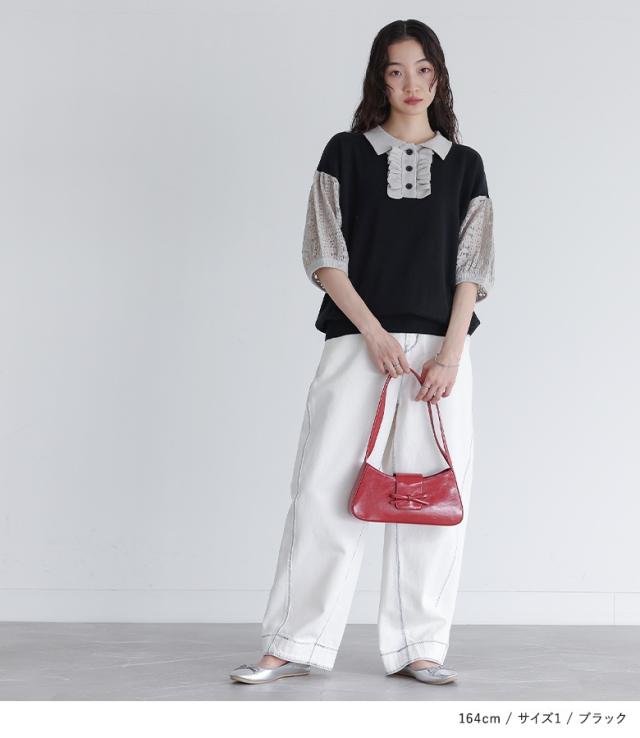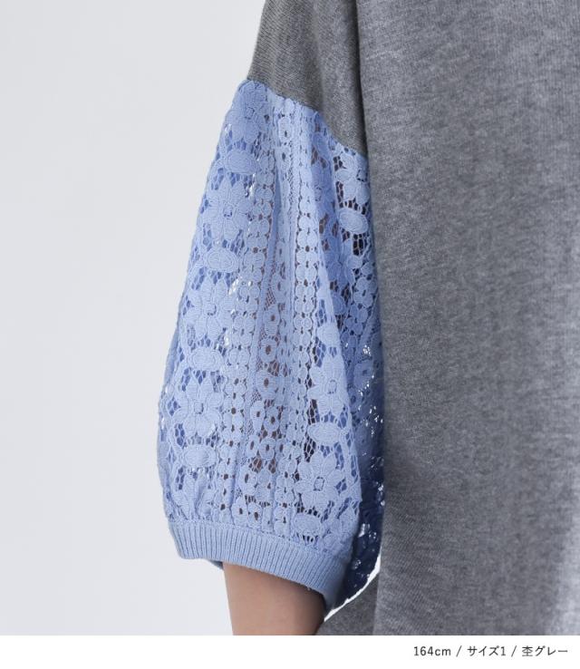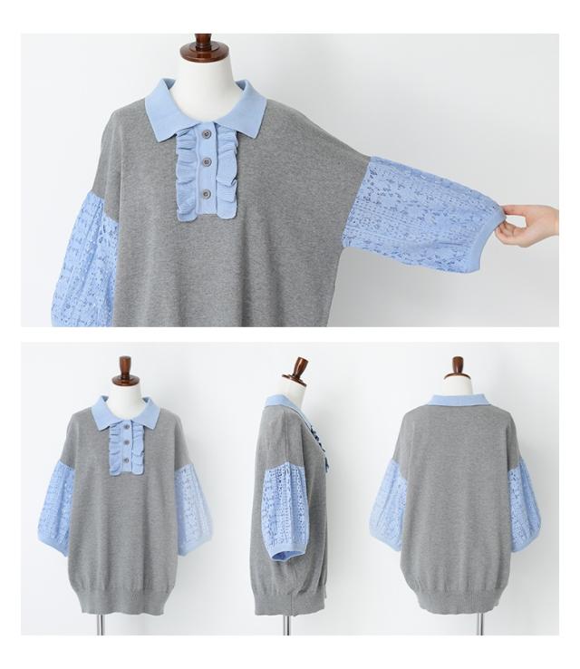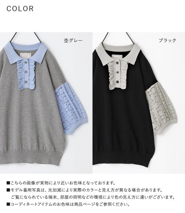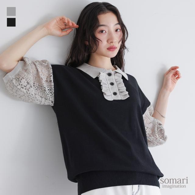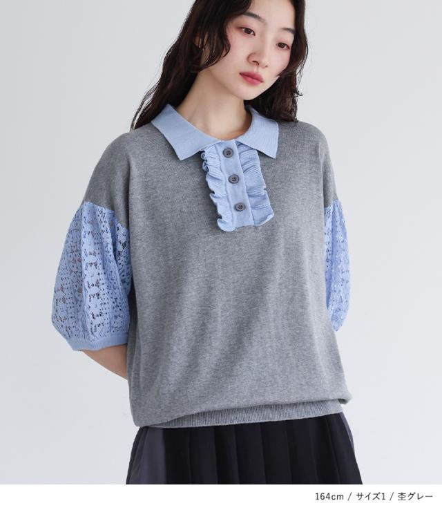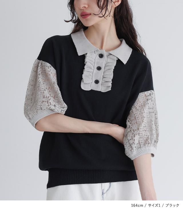 『袖レース配色ポロニット』【メール便不可】【20】[ニット 半袖 サマーニット レディース トップス ポロニット ポロシャツ フリル レース ぽわん袖 襟付き ハイゲージ 春 夏 秋]