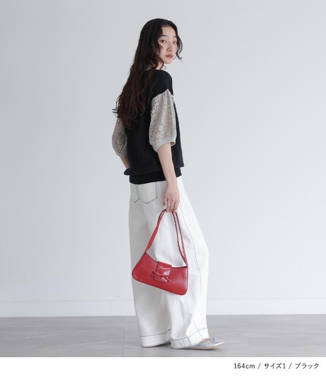 ■デザイン 袖レースと前立てフリルで、ロマンティックな雰囲気をまとうポロニット。襟、前立て、袖のレース部分を配色にすることで、デザインのアクセントにしています。さらに、ぽわんとした袖のシルエットが、女性らしい柔らかな印象を引き立ててくれます。 ■コーディネート 一枚で主役になるデザインなので、シンプルなボトムスと合わせるだけで着こなしが完成します。デニムでカジュアルダウンしたり、きれいめスカートと合わせてエレガントに着こなすのもおすすめ。 ■素材 ハイゲージのニットと袖レースで、暑すぎずさらりとした着心地。軽やかな肌触りで、暑い季節でも心地よく着用いただけます。 ■製品についての注意書き ニット製品につきまして。 ニット素材の持つ特性として編み上げる行程やプレス仕上げによって多少サイズや風合いの個体差が生じる場合がございます。 着用した時と実寸の長さが変わる可能性がございます。 また、着用の際ピリングが避けられず、完全に防止することはできません。毛玉取り器等で丁寧に取り除いてください。 ご了承の上、ご購入いただきますようお願いいたします。 |