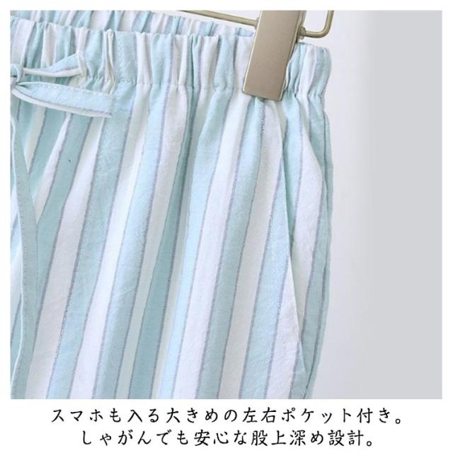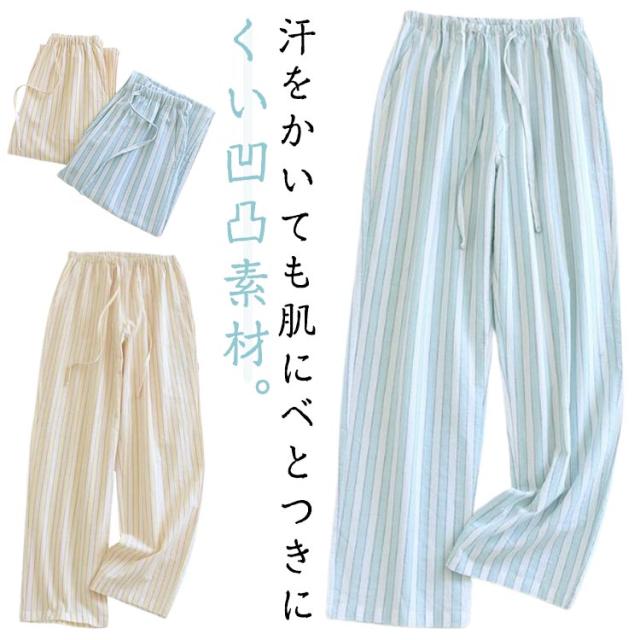 | 汗をかいても肌にべとつきにくい凹凸素材。綿混で柔らかく、優しい肌触りの快適な着心地。 一日中リラックスできて、おうちタイムにもパジャマにも◎。 今シーズンは、お手持ちのTシャツにも合わせやすい、ナチュラルカラーのストライプ柄に変更になりました。 着心地も見た目も涼しげで、細見え効果も。 腰は総ゴム使用で着脱も楽ちん。調節紐付きです。スマホも入る大きめの左右ポケット付き。しゃがんでも安心な股上深め設計。 カラーは、ベージュとブルーから、サイズはM、L、XL、2XLからお選びいただけます。 | |