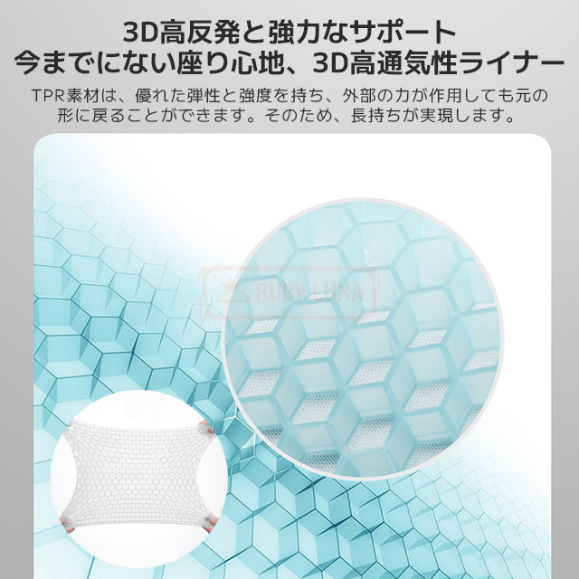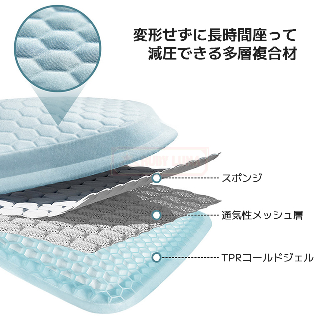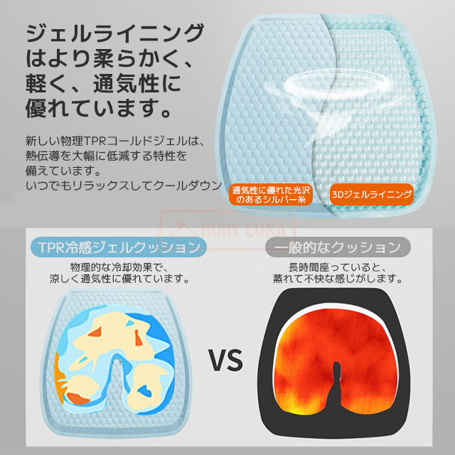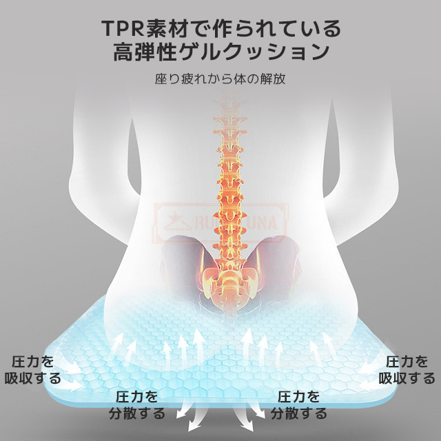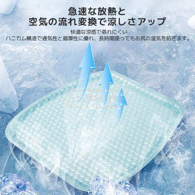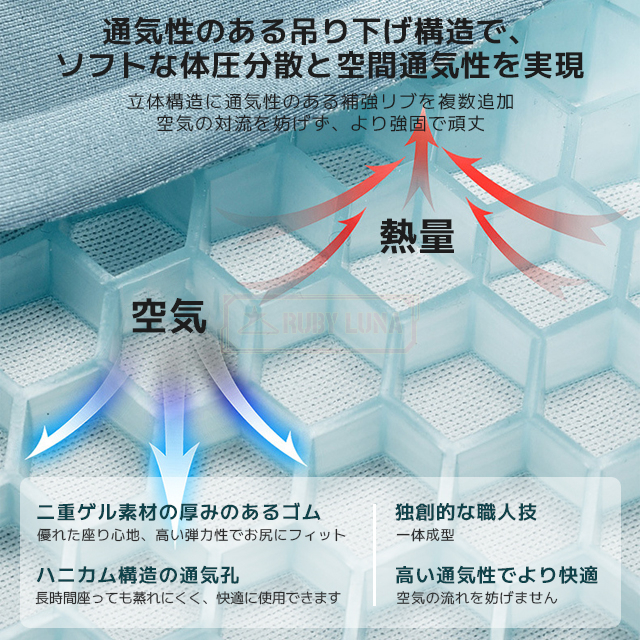 | 【通気性が優れるクッション】 | ◆このゲルクッションはTPRゲル素材を採用して、そしてハニカムの内部構造デザインなので、長時間座ると蒸し暑くしなくて、優れる通気性が保持しています(綿クッションとの比較テスト結果から見ると、ゲルクッションは4時間座ってからお尻の温度が上がりにくいでした)。 |