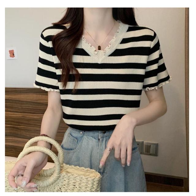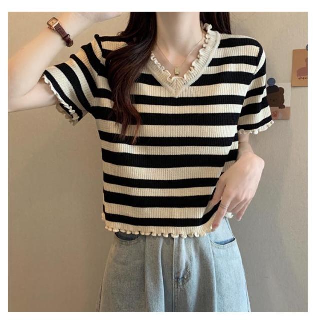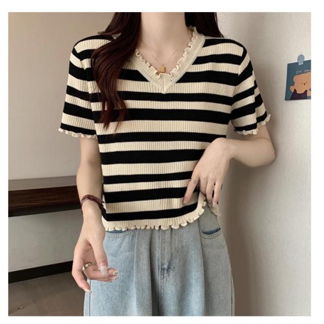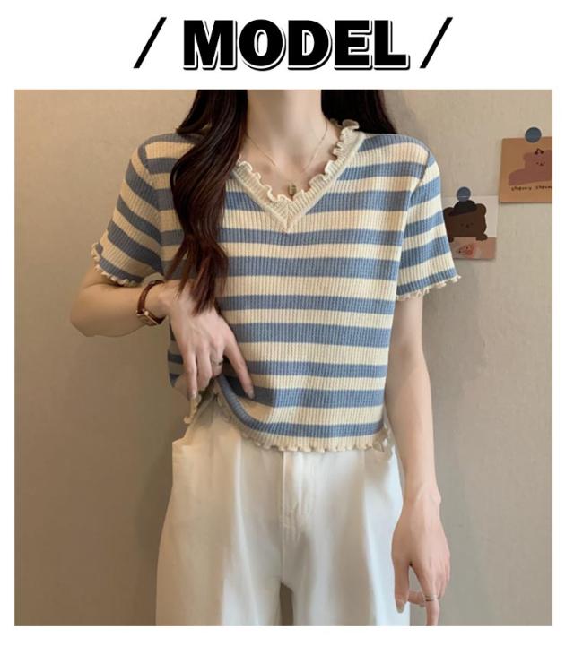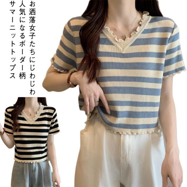 ボーダー柄 半袖ニットソー 半袖tシャツ 可愛い レディース かわいい ショート丈 ボーダー柄サマーニット ストライプ フリル 夏トップス トップス Vネック 夏服 大きいサイズ 春夏 ニットトップス キレイめ 着?せ サマーニット 夏Tシャツ 可愛い お洒落