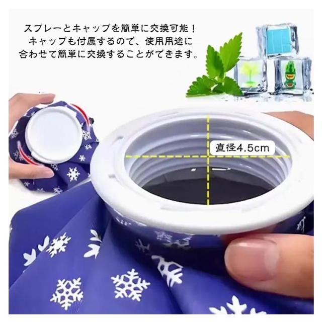 | スプレーノズル付きアイシングバッグ。スプレーノズル付きなので、涼感ミストで夏場のクールダウンに最適! スプレーとキャップを簡単に交換可能!キャップも付属するので、使用用途に合わせて簡単に交換することができます。 様々なシーンで大活躍!ケガや日焼けなどのほてり、発熱時のアイジングスポールやレジャー・アウトドアでのクールダウンにも大活躍します。発熱時/捻挫/熱中症対策/冷やしたい時/暑い時/急な痛みなど! 長時間の使用を考えて、選ばれた肌触りのいい素材を使用。手軽なサイズとかわいいデザインで、使い勝手のいいアイテムです。 コンパクトに折り畳んでカバン等にも入りやすいサイズなので、持ち運びも非常に便利です。 | |
