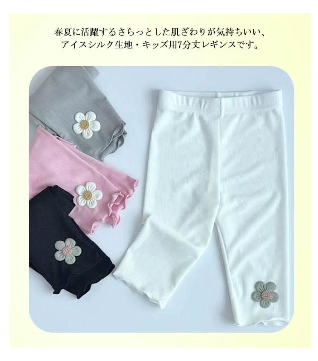 | 春夏に活躍するさらっとした肌ざわりが気持ちいい、アイスシルク生地・キッズ用7分丈レギンスです。 良く伸びるので、何かと動き回る子供たちもストレスなく履けます。 デイリー使いはもちろん、スポーツにも使えます。 お出かけ着用可能なデザイン!スカートやワンピース、Tシャツにも相性抜群で、コーデの幅が広がります。ベタつき防止のインナーとしてもおすすめです。 | |