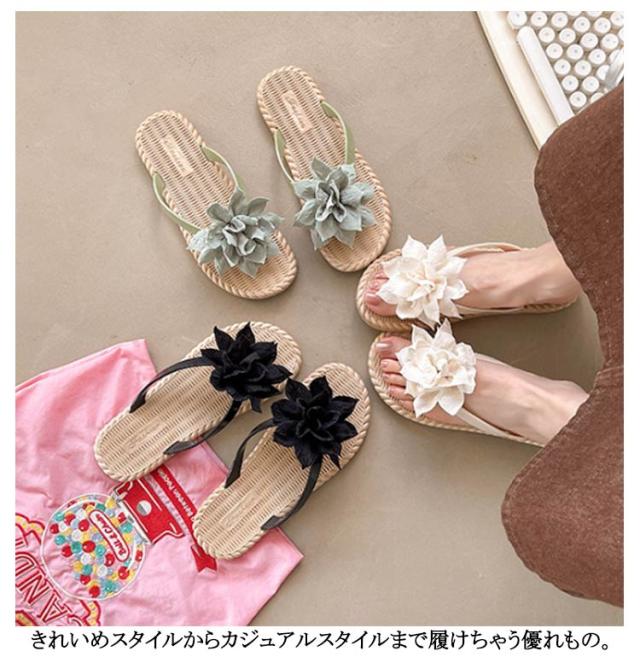 | 立体的なお花が可愛い、軽い履き心地フラットサンダル! 夏らしいデザインでこれからの季節に大活躍間違いなしです。 きれいめスタイルからカジュアルスタイルまで履けちゃう優れもの。 気軽に履けるのが嬉しいコーデを選ばない万能サンダル。 室内やオフィスでスリッパとしても、アウトドアにもお使いいただけます。 | |