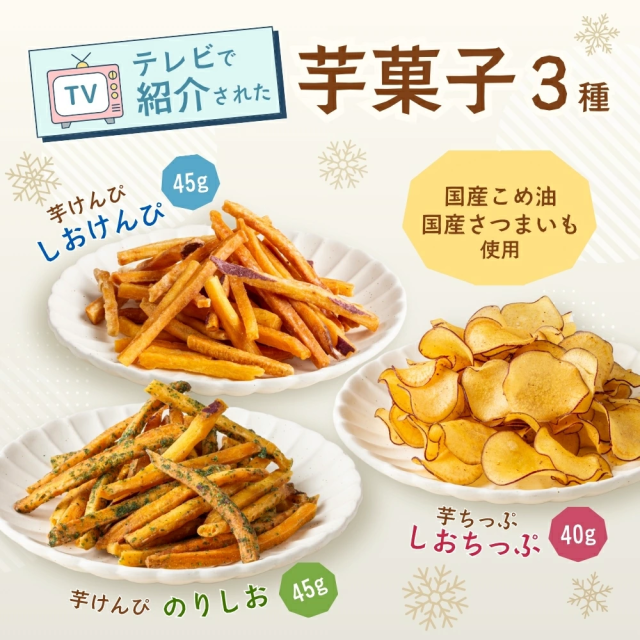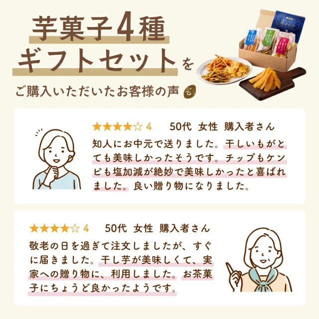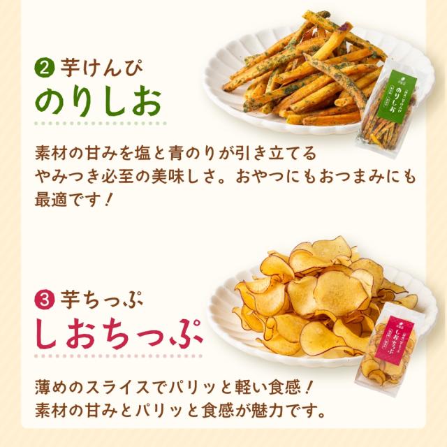 - 初めてお芋のセット品を購入しましたが、お芋好きには食べ比べられて良いと思います。中でも干し芋はレンジで解凍して頂きましたが、お芋の風味と硬さがちょうど良かったです。チップスは塩が効き過ぎた感じでちょっ...