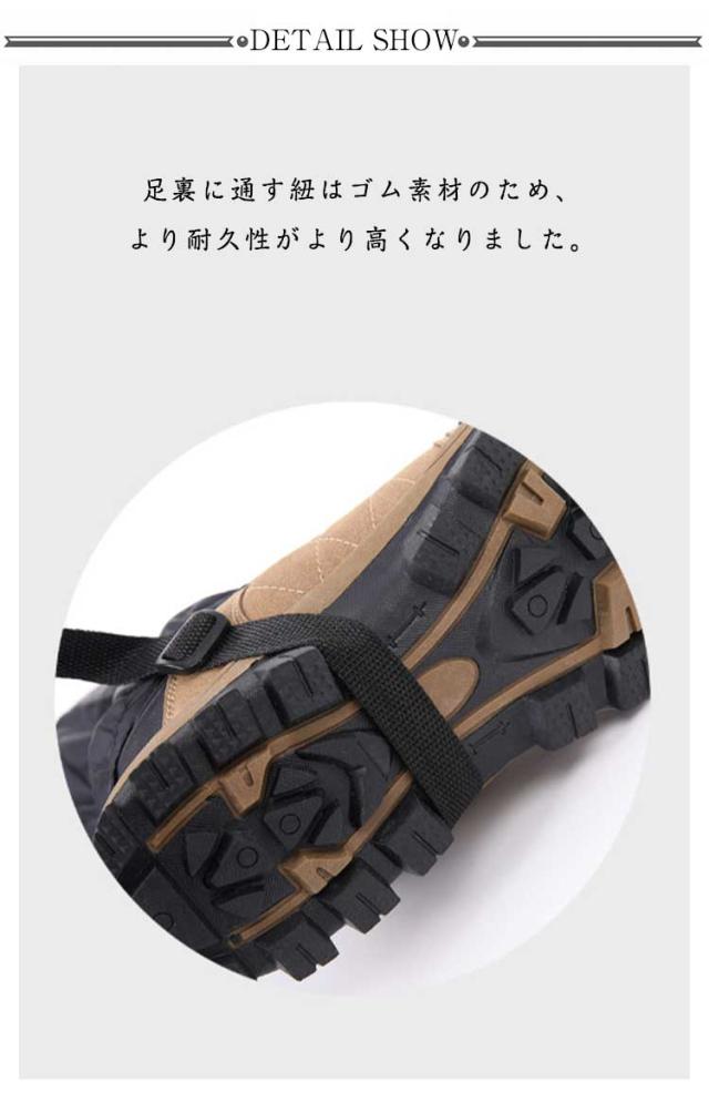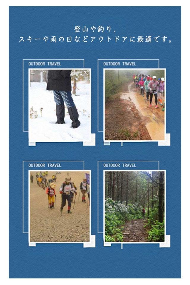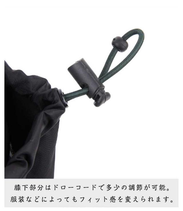 | 雨、雪、泥などからズボンや靴が濡れるのを防ぐレッグカバーです。 長さが約40cmあるので膝下までカバーできます。 膝下部分はドローコードで多少の調節が可能。服装などによってもフィット感を変えられます。 足裏に通す紐はゴム素材のため、より耐久性がより高くなりました。 ズボンや靴の汚れを防ぐ!雨や雪、砂など侵入防止、足元の汚れ、泥はね防止に役立ちます。 登山や釣り、スキーや雨の日などアウトドアに最適です。 | |