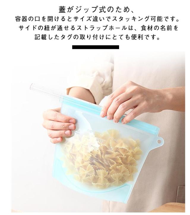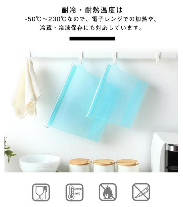 | 密閉してしっかり保存!繰り返し使えるエコな保存バッグです♪ 安全性と耐久性の高いシリコン製なので、洗って繰り返し使うことが可能です。 耐冷・耐熱温度は-50℃〜230℃なので、電子レンジでの加熱や、冷蔵・冷凍保存にも対応しています。 蓋がジップ式のため、容器の口を開けるとサイズ違いでスタッキング可能です。 サイドの紐が通せるストラップホールは、食材の名前を記載したタグの取り付けにとても便利です。 計量カップのようなメモリ付きで、調理道具としての活用もおすすめです。 マチが広めのデザインなので、電子レンジで調理する際にも、倒れにくく安定性があります。 シンプルでお洒落なデザインになっているため、冷蔵庫の中を綺麗に整理整頓することができます。 | |