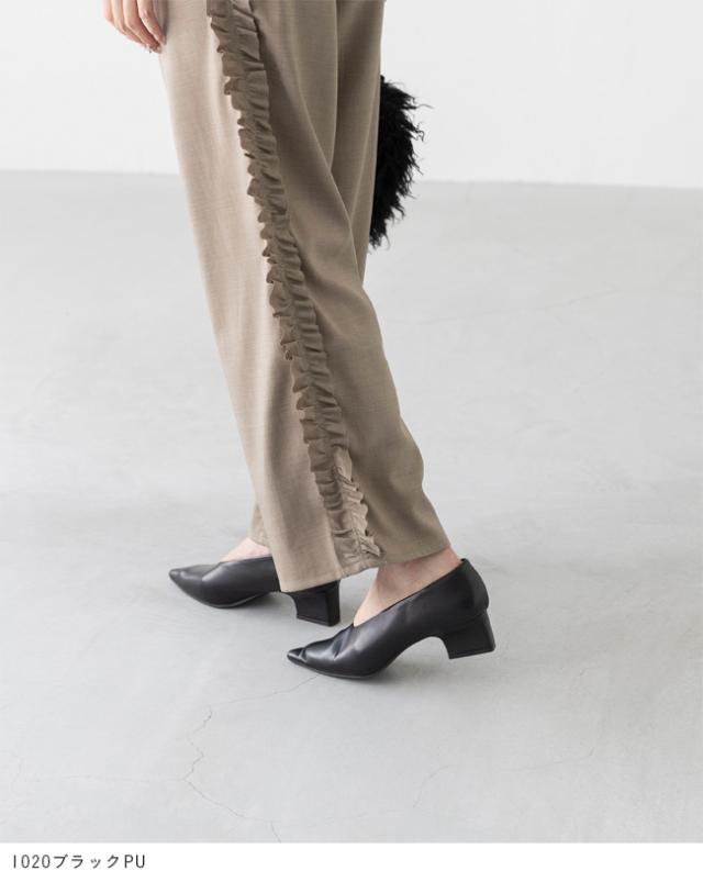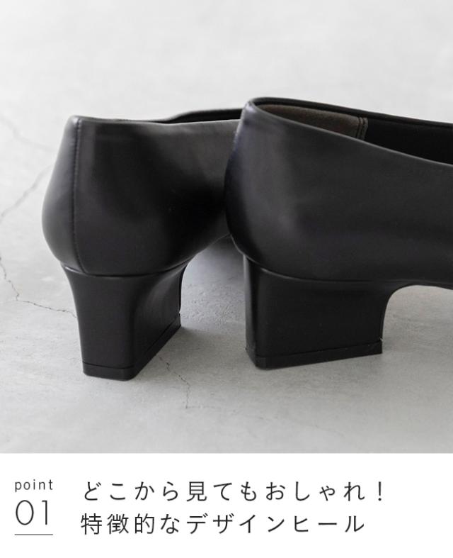 後ろ姿は華奢に、横から見ると存在感のある幅の広さ。特徴的なデザインのヒールが、どの角度から見てもおしゃれな足元を演出します。
