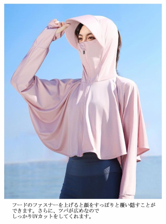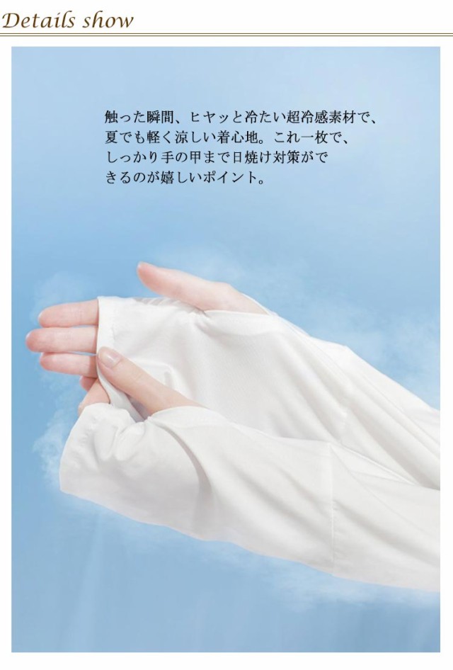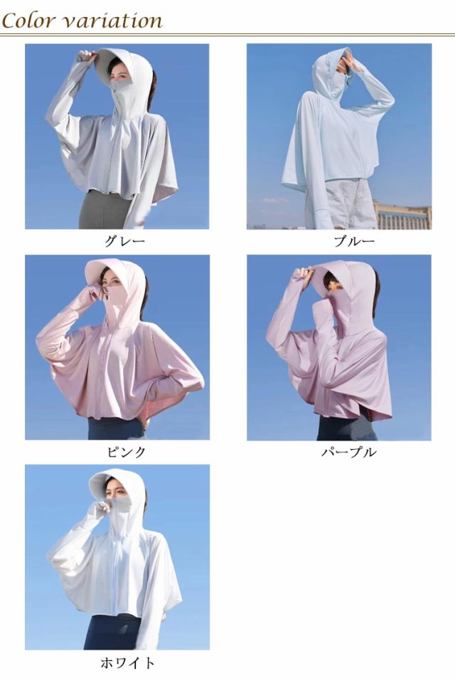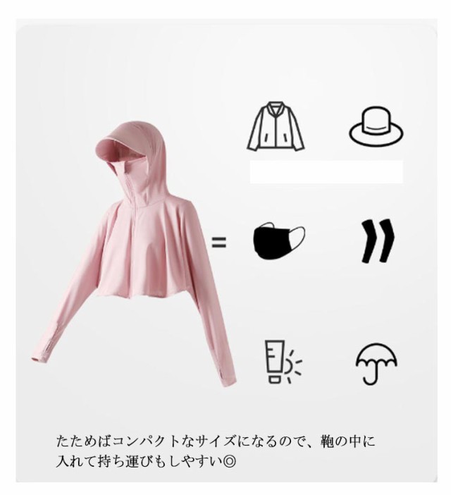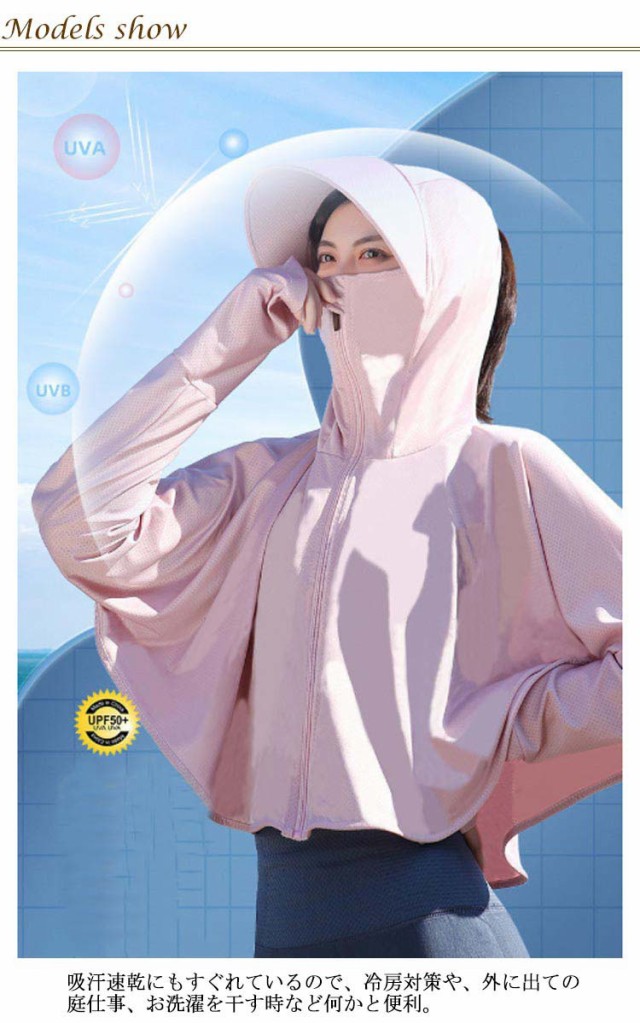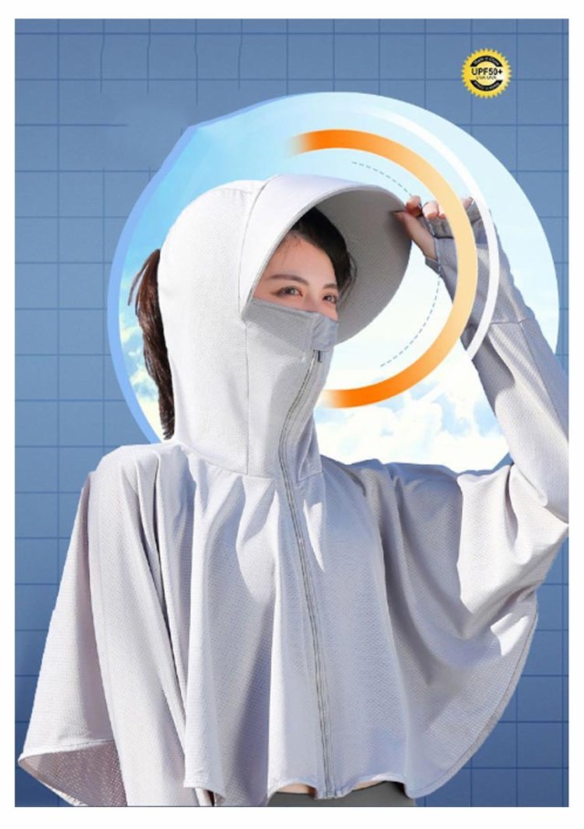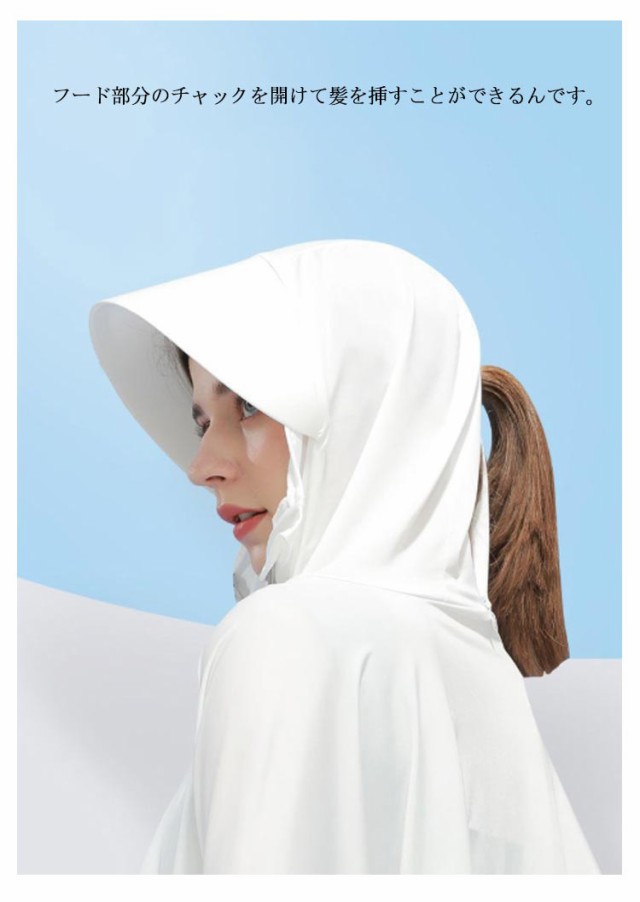 | 接触冷感・吸汗速乾・超軽量化・紫外線360度カット・UVカットパーカー 触った瞬間、ヒヤッと冷たい超冷感素材で、夏でも軽く涼しい着心地。 これ一枚で、しっかり手の甲まで日焼け対策ができるのが嬉しいポイント。 フードのファスナーを上げると顔をすっぽりと覆い隠すことができます。さらに、ツバが広めなのでしっかりUVカットをしてくれます。 たためばコンパクトなサイズになるので、鞄の中に入れて持ち運びもしやすい◎ また、薄手の生地ながらも高いUV遮蔽率で、紫外線をしっかりカットします。 吸汗速乾にもすぐれているので、冷房対策や、外に出ての庭仕事、お洗濯を干す時など何かと便利。 フード部分のチャックを開けて髪を挿すことができるんです。 | |