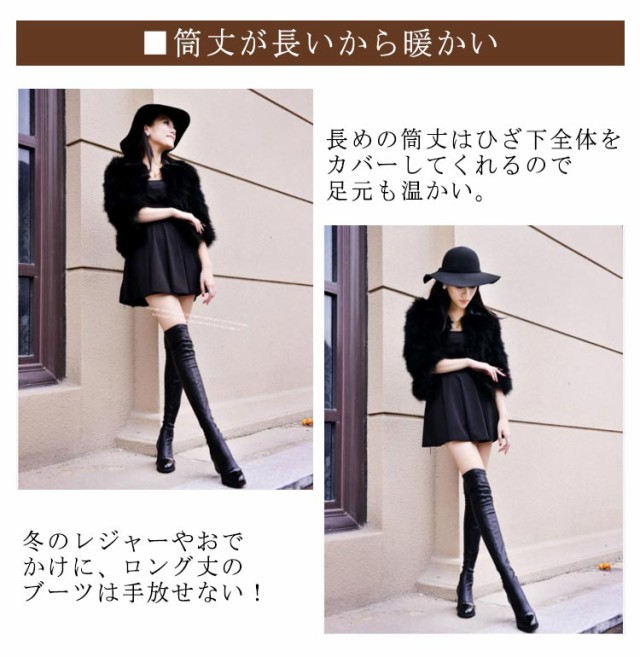 | 厚底で歩きやすいニーハイブーツ♪ヒール高さ5cmで疲れない! ■歩きやすい 5cmヒールなので、安定感があって歩きやすい上に、脚長効果もあり! 一日中歩いても足が痛くない&疲れないと好評です。 ■筒丈が長いから暖かい 長めの筒丈はひざ下全体をカバーしてくれるので足元も温かい。 冬のレジャーやおでかけに、ロング丈のブーツは手放せない! ■プチプラでハイデザイン スパッツでブーツインスタイルにも、ミニスカートやショートパンツにも♪ どんなコーデにも合わせやすい、きれい系優秀デザインなのに、手の届きやすいお値段のロングブーツです。 ■お手入れ楽ちん 合皮だから多少の雨や水濡れなら気になりません。 少しの汚れならサッと拭けばキレイになって、お手入れらくちん!(レインブーツのように完全防水ではありません) | |