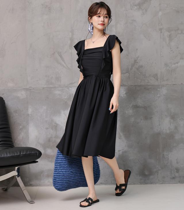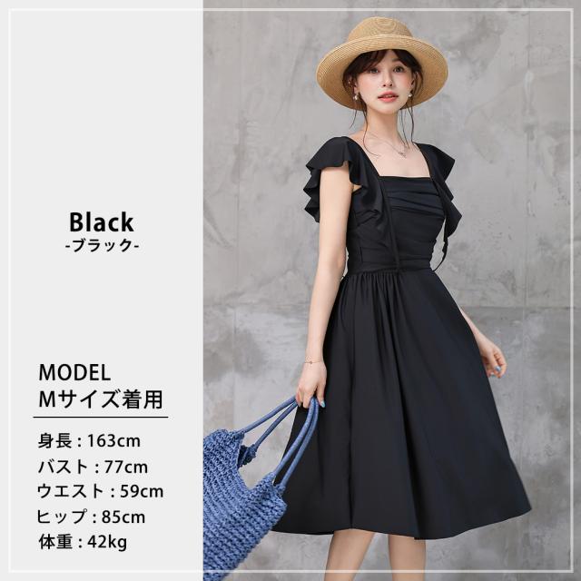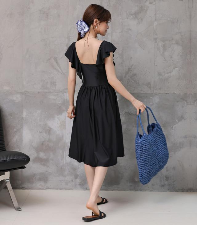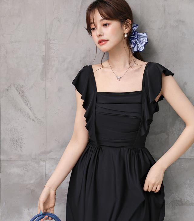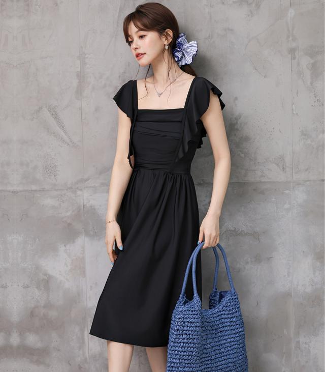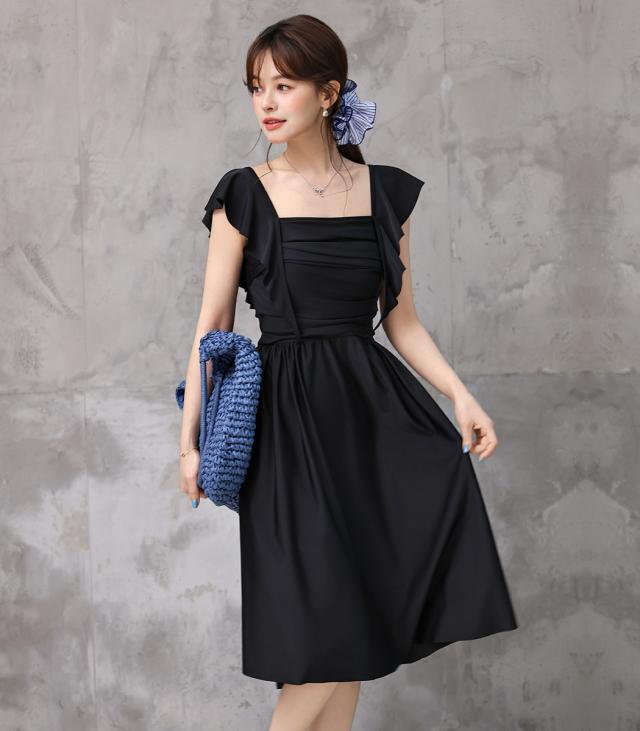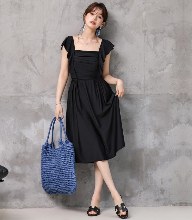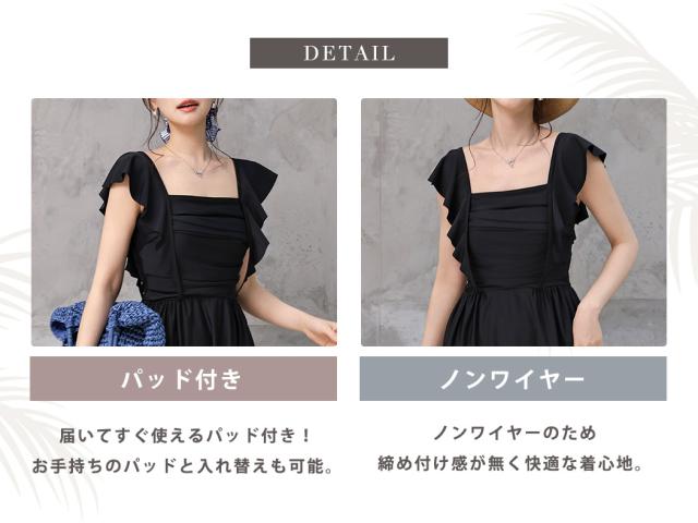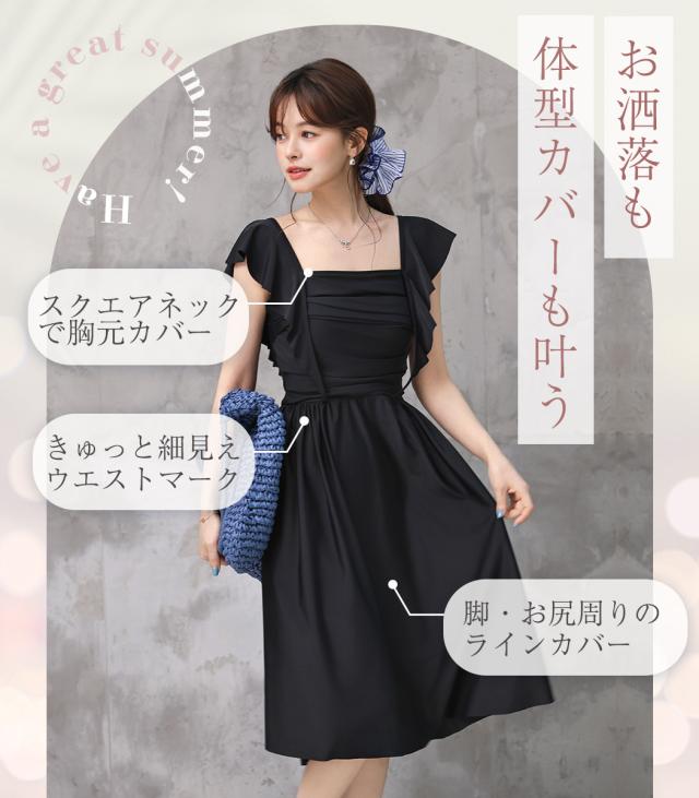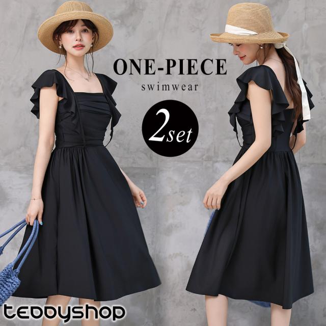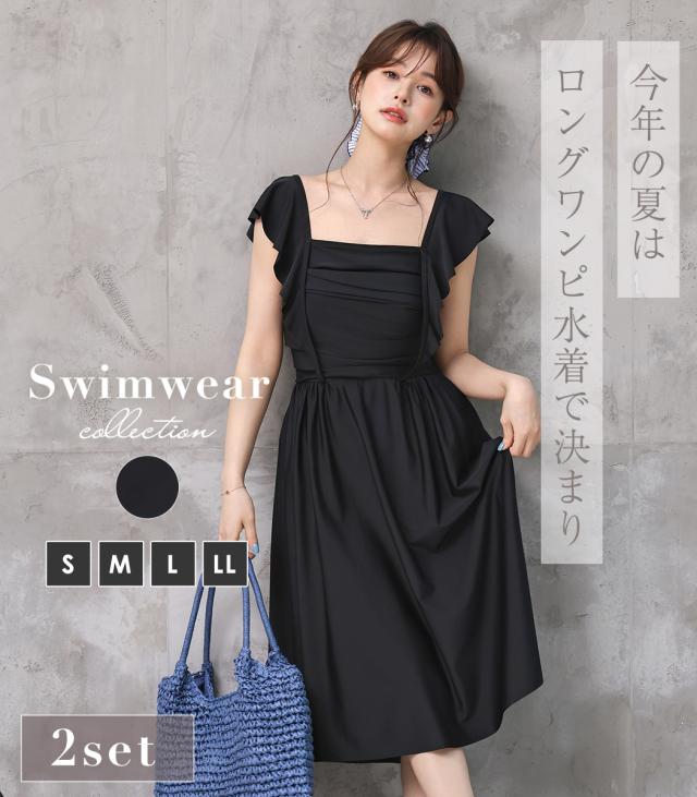 水着 ワンピース 体型カバー レディース 胸パッド付き セパレート ショーツ 2点セット ロングワンピース ミモレ丈 スクエアネック ドレープ ウエストマーク ノンワイヤー バスト 盛れる ウエスト ヒップ 太もも 脚 カバーアップ 無地 黒 夏