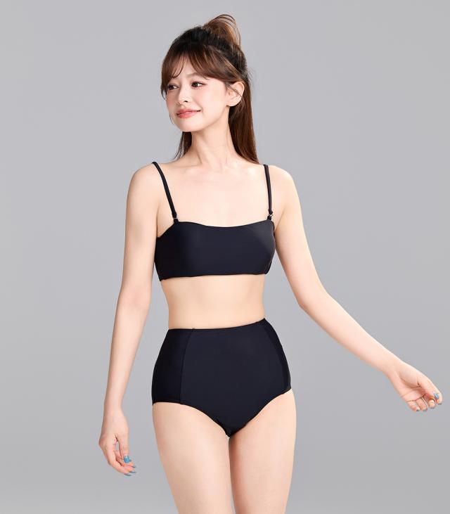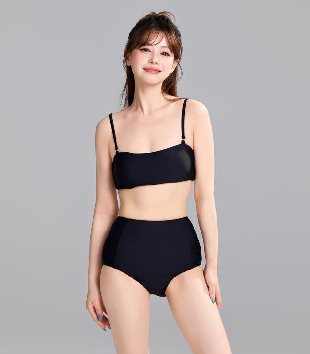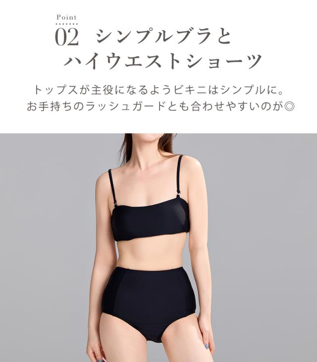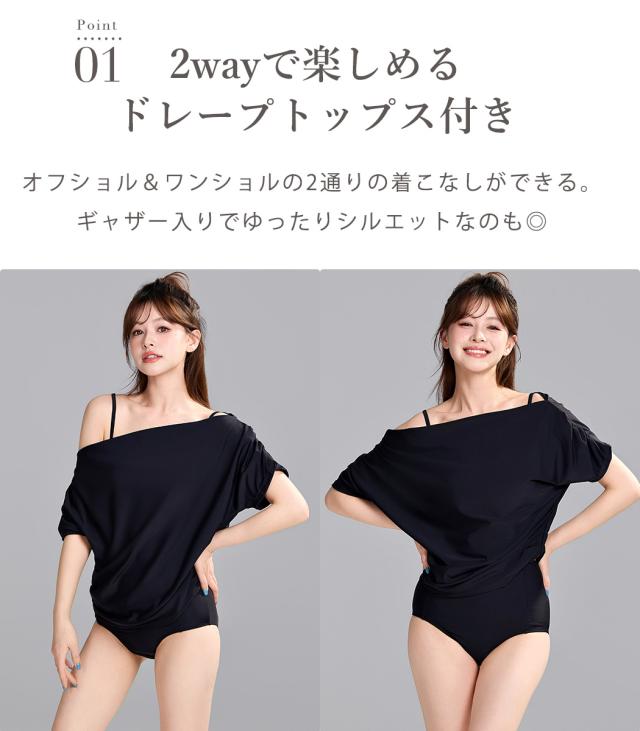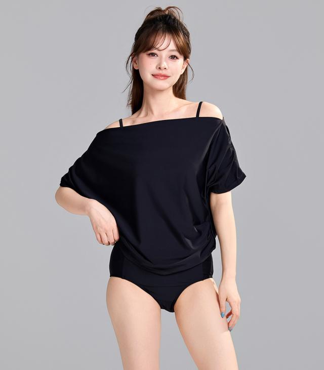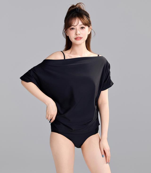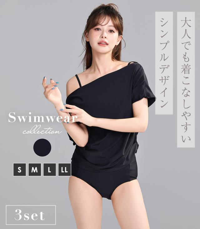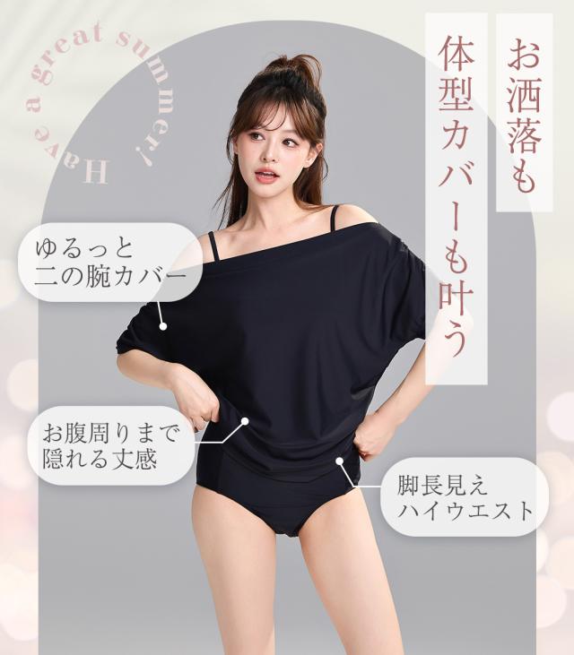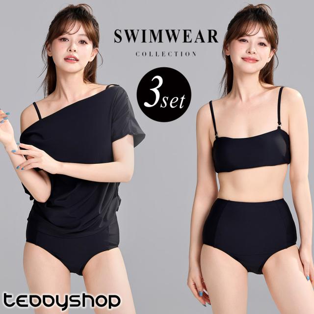ビキニ 水着 レディース トップス 3点セット セパレート ハイウエスト 半袖 2WAY Tシャツ ドレープ オフショルダー ワンショルダー ギャザー ノンワイヤー パッド付 肩紐調節 二の腕 ウエスト お腹 カバーアップ 無地 シンプル 黒 プール