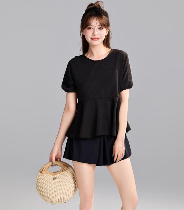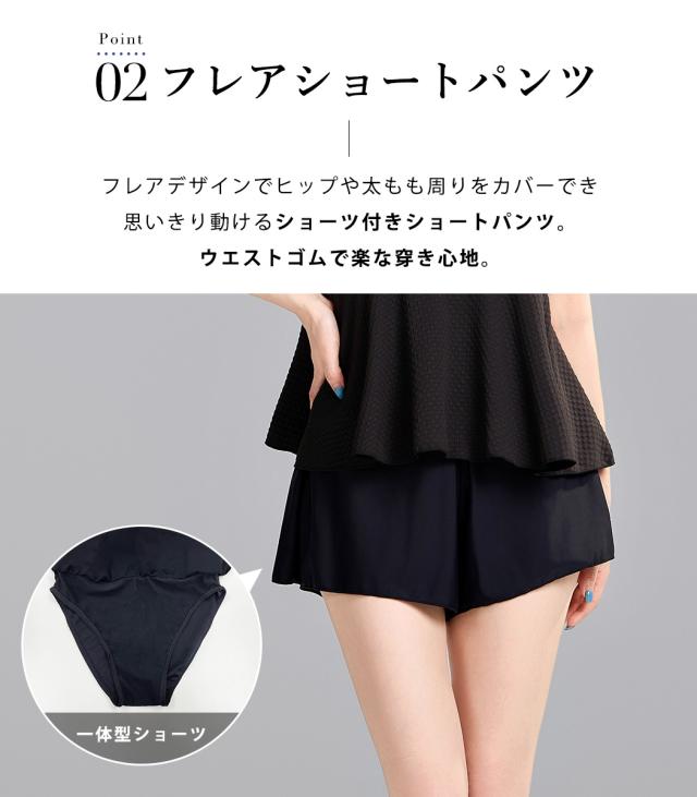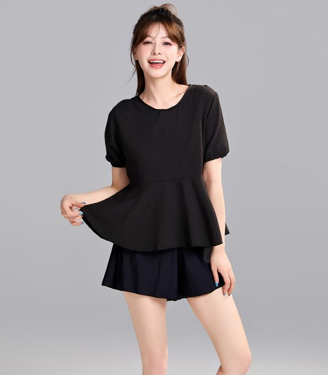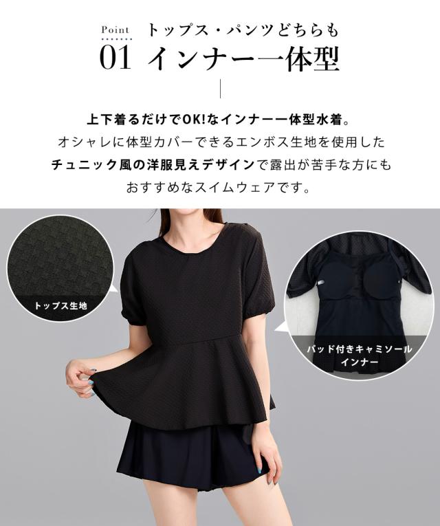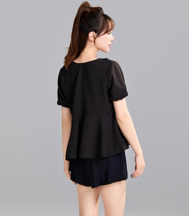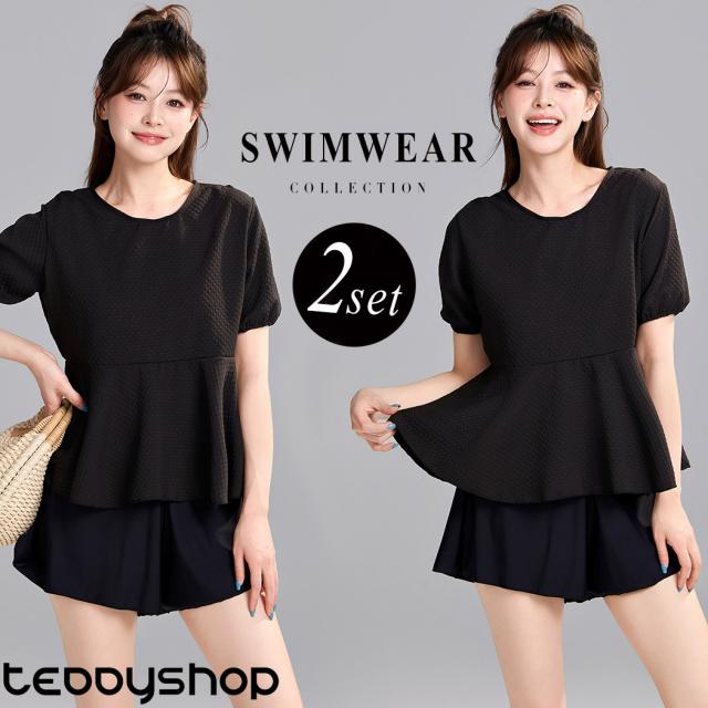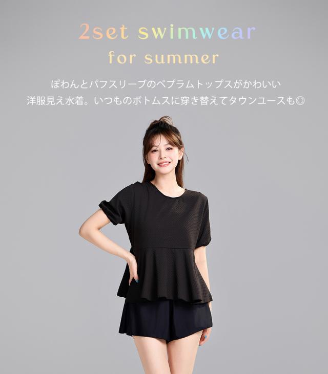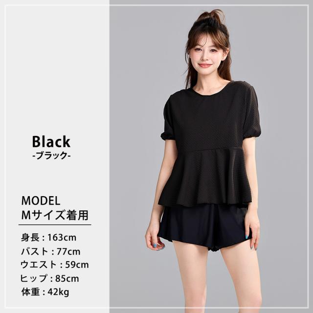 水着 レディース 体型カバー セパレート 2点セット トップス 半袖 袖あり ペプラム フレア パフスリーブ ショートパンツ お洋服見え 露出控えめ インナー一体型 ノンワイヤー パッド付き 二の腕 ウエスト ヒップ お尻 太もも カバーアップ 黒