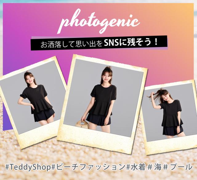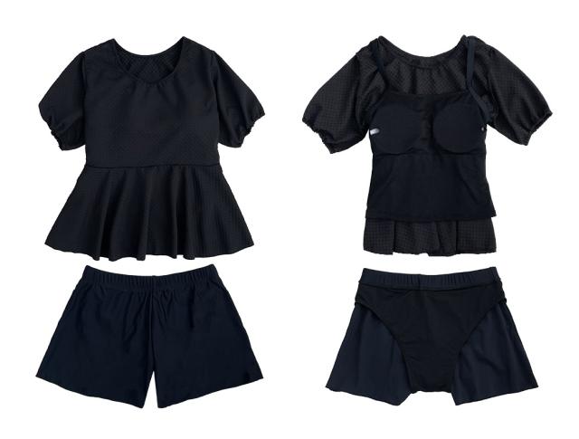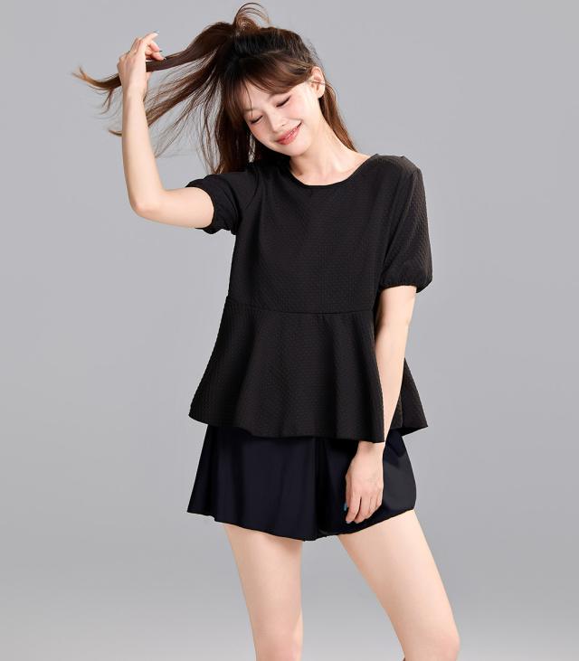 ぽわんとパフスリーブのペプラムトップスがかわいい洋服見え水着。