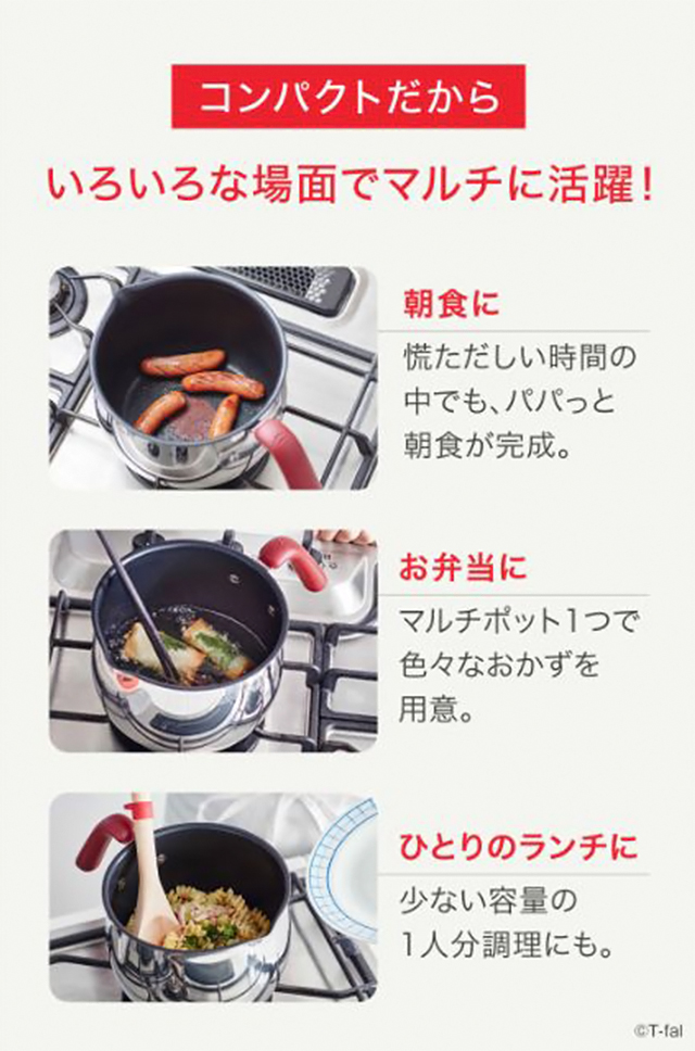 小回りの利くコンパクトサイズのマルチポット。焼く・煮る・茹でる揚げるなどマルチに使えて、朝食やお弁当づくりにはもちろん、在宅時のひとりランチや副菜調理にも活躍します。いつでもコンロ側に置いておけるサイズ感なので、手にとってサッと使えるのも魅力です。