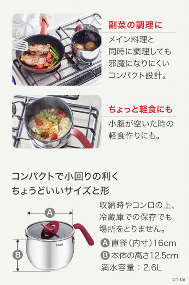 商品名 オプティスペースIH ステンレス マルチポット16cm G74683/G74783/G75183 メーカー ティファール カラー チャコールグレー、ルージュ、ラテ 商品サイズ(約) 本体:幅27.4×奥行き17.4×ふた込高さ13.6cm 本体のみ高さ12.5cm