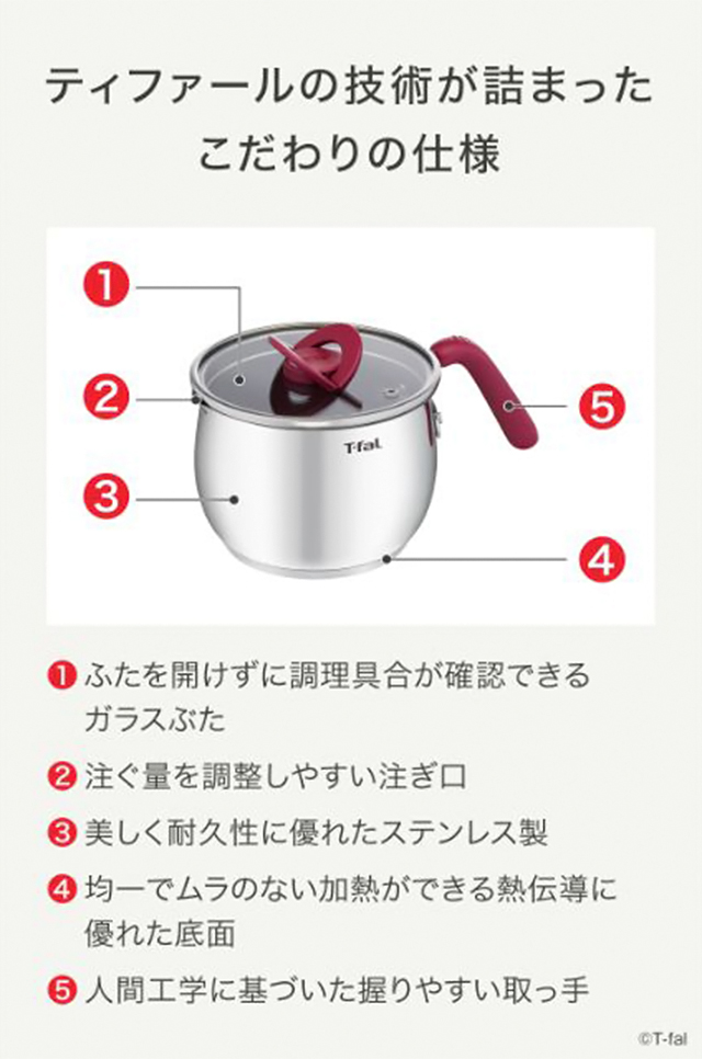 注ぎ口が付いた丸みのあるフォルムで、ケトルのように注ぎやすいのが特徴。 外側は美しいツヤ感あるステンレス製で、耐久性にも優れ金属へらも使えます(角の丸いものをお使いください)。中身が見えるガラス蓋付き。