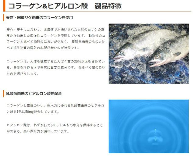「コラーゲン&ヒアルロン酸」は、国内で水揚げされた天然の食用サーモンから抽出したコラーゲンと、