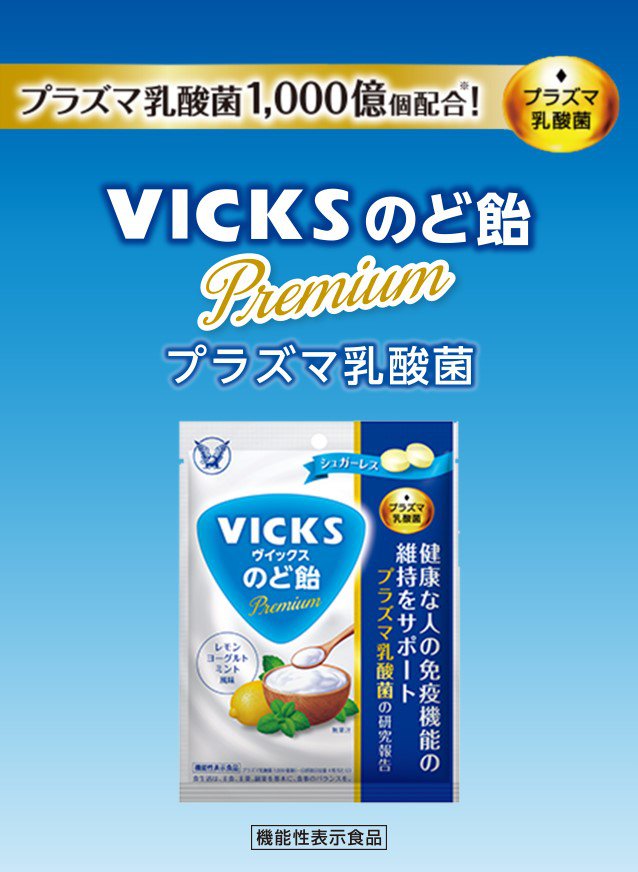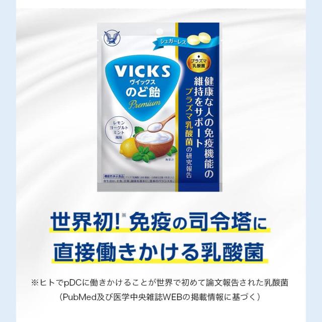 ●ヴイックスのど飴Premium プラズマ乳酸菌は、健康な人の免疫機能の維持をサポートするプラズマ乳酸菌1,000億個配合※したのど飴です。