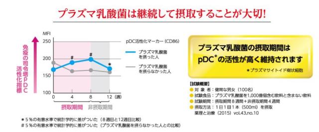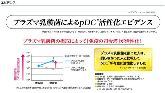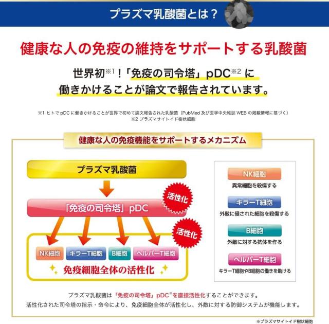 本品には、プラズマ乳酸菌(L. lactis strain Plasma)が含まれます。プラズマ乳酸菌はpDC(プラズマサイトイド樹状細胞)に働きかけ、健康な人の免疫機能の維持に役立つことが報告されています。