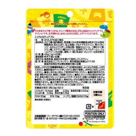 ぶどう糖(国内製造)、麦芽糖、DHA含有精製魚油粉末(DHA含有精製魚油、乳たんぱく、加工油脂)、マルトデキストリン、果汁(オレンジ・みかん)パウダー、米抽出物/結晶セルロース、二酸化ケイ素、クエン酸、ステアリン酸カルシウム、甘味料(アスパルテーム・L-フェニルアラニン化合物)、香料、(一部に乳成分・オレンジ・大豆を含む)