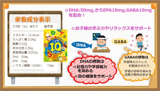 3粒で、DHA50mg、さらに、EPA10mg、GABA(ギャバ)10mgが摂取でき、お子様の学ぶ力やリラックスをサポートします。