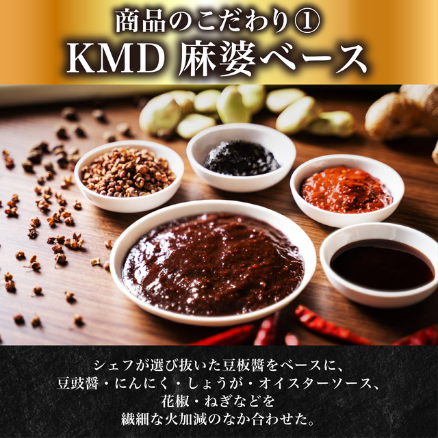 【KMD麻婆ベース】豆板醤(中国製造)、たん白加水分解物、トウチ醤、チキンエキス、しょうゆ、にんにくペースト、ねぎ加工品、砂糖、香味食用油、生姜ペースト、酵母エキス、食塩、かきエキス調味料、花椒粉末、にんにく粉末、こしょう粉末/調味料(アミノ酸等)、酒精、加工でんぷん、カラメル色素、増粘剤(キサンタン)、酸味料、香料、甘味料(サッカリンNa、ステビア、カンゾウ)、(一部に乳成分・小麦を含む)
