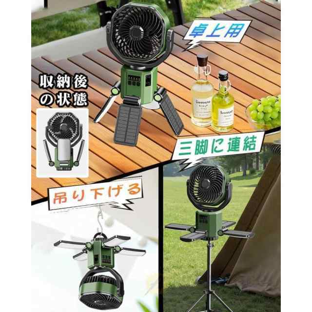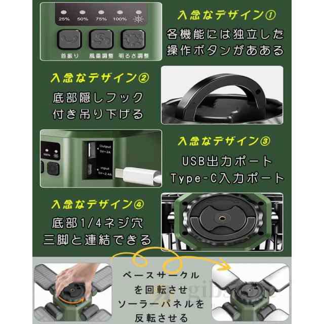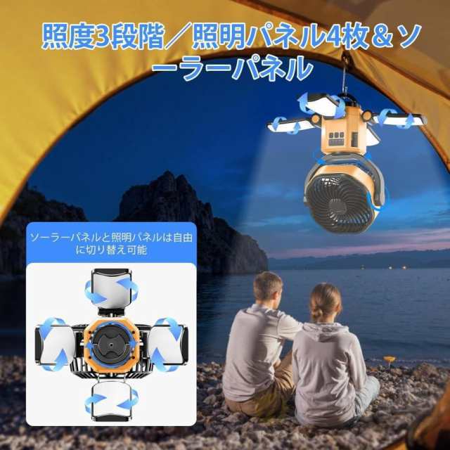 風量:微風(1.5m/s)〜強風(4.8m/s)まで精密調節,照明:読書用(300ルクス)/リラックス(150ルクス)/ナイトライト(50ルクス),省電力モード時は消費電力を40%削減。キャンプ 扇風機は4段階風速モードがあり、風量切替ボタンを押すたびに、自分に適切な風速モードを選べます。20時間の超長時間連続運転が可能に。終日のイベントも快適に過ごすことが出来ます。熱中症、発熱、あるいは日焼けしている場合はこのソーラー扇風機を使いながら体の温度を下げることができます。
