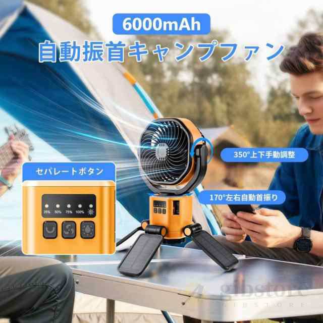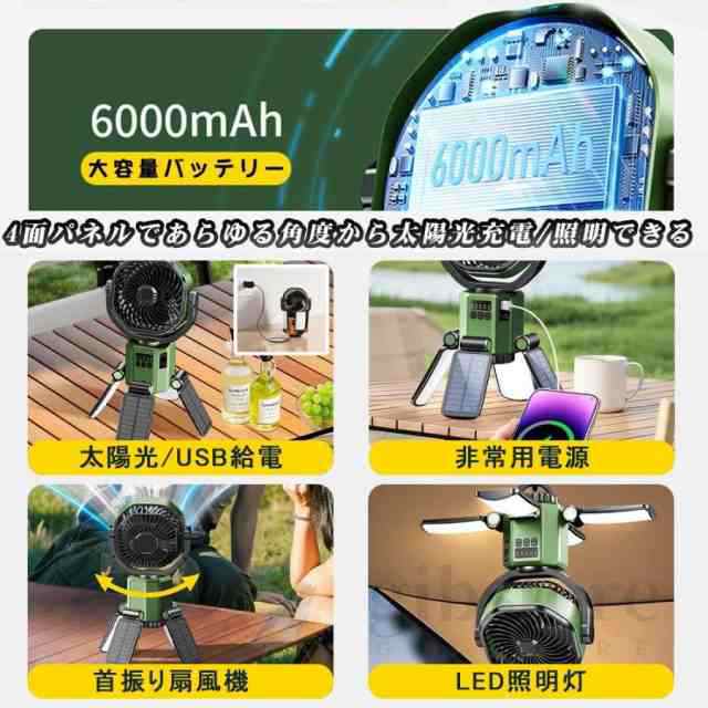 【ソロキャンプ必携】 扇風機 キャンプ扇風機 ソーラー扇風機 LED照明 6000mAh 超長航続 4 枚ソーラーパネル 自動首振り 瞬間冷却 強力送風 太陽光/USB充電式 省エネ 防災 熱中症対策 携帯扇風機 野球観戦 業務用 花火大会 アウトドア