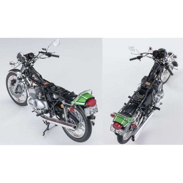 カワサキKHは、マッハシリーズから受け継ぐ独特の2ストローク3気筒エンジンを搭載。「ケッチ」の愛称で親しまれ、現在でも根強い人気があるオンロードバイクです。1979年11月にカワサキライムグリーンのレーシングカラーでリリースされた排気量400ccの最終モデル「KH400-A7」を、徹底した実車取材により完全新金型でキット化します。パーツの色分けとメッキパーツで塗装しなくても実車に近いイメージを再現。