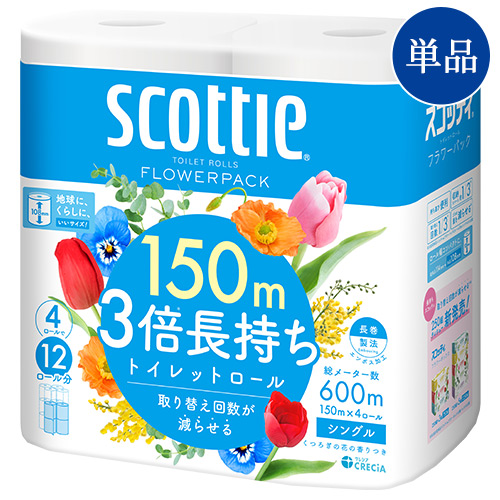 4ロールで12ロール分の長さ(従来品スコッティ フラワーパック12ロール シングルとの比較。)コンパクトで持ち帰りがラク、収納スペースの削減、たっぷり使えて取り替えの手間を軽減。様々なメリットが詰まった長持ちトイレットロールです。独自の長巻製法とエンボス加工により、長持ちとやわらかさを両立しています。主原料はパルプ。紙パック等を原料とした高品質パルプも一部使用しています。ミシン目入り。蛍光染料は使用していません。