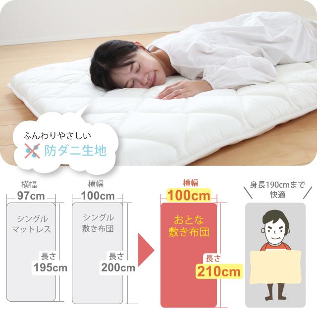 敷布団 シングル 固綿入 三層構造 腰痛予防 シングルロング 大人 防ダニ 敷布団 ごろ寝 おとな敷き布団(100×210cm) 日本製