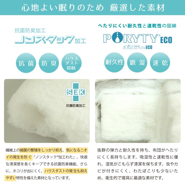 | 赤ちゃんにも安心の素材を使ったシングルロングサイズの大人用敷き布団です。 しっかりとした厚みがある防ダニ仕様で寝返りしやすく、大人や子ども、赤ちゃんのお昼寝布団やプレイマット、添い寝やごろ寝マットとしても使える万能敷きふとんです。 Point1: 「おとな敷き布団」はしっかりした高密度の固綿を柔らかい綿で挟み込んだ3層構造となっております Point2: 表地・中綿・固綿ともに軽量のポリエステル素材で作られています。厚みがあるから体の沈み込みが抑えられ、底付き感なくまだ未発達の赤ちゃん骨格から大人の背骨までしっかりと支えます。【優れた抗菌防臭効果で細菌の増殖を制御し、ホコリが出にくく、ハウスダストの発生も押さえやすい特性を備えた素材】で高密度固綿を包み込む3層構造だからへたりにくく、スムーズな寝返りをうつことができ腰痛予防し、快適な眠りをサポートします。 Point3: 通常のシングル敷きふとんサイズよりも縦に10cm大きいシングルロングサイズになっています。身長190cmまで対応しているので、足を延ばしてゆったりすることが出来ます。 日本国内工場にて製造しております。安心してご利用いただくため、出荷前に検針・検品を行っております。 《こだわりの厳選素材》 ☆ダニ通過率0%の高密度生地を使用 品質検査で**ダニ通過率0%**が実証された高密度生地を採用。繊維の隙間が極めて細かく、ダニが入り込む余地がありません。薬剤を使わずに防ダニ効果を発揮するため、赤ちゃんにも安心。さらに綿より軽量で、扱いやすいのも特徴です。 ☆抗菌防臭加工 ノンスタック加工素材☆ 繊維上の細菌の繁殖をしっかり抑え、気になるニオイの発生を防ぐ「ノンスタック加工わた」。快適な清潔感を長くキープできる抗菌防臭機能。さらに、ホコリが出にくく、ハウスダストの発生も抑えやすい特性を備えた素材となっています。 ☆へたりにくい耐久性と速乾性 PORYTYECO☆ 抜群の弾力と耐久性を持ち、布団がへたりにくく長持ちします。吸湿性と速乾性に優れ、湿気がこもらず清潔を保ちます。虫やカビが付きにくく、わたぼこりも少ないため、衛生的で寝具に最適な素材です。 ※3ヶ月未満の首の座っていないお子様が就寝用としてご使用になる場合、沈み込みの心配のない「固綿のみのマットレス」のご使用をおすすめしております。同サイズの取り扱いはございませんので、ベビーサイズ70×120cmでご紹介させていただきます。 【固綿マットレスシリーズ】ベビー敷布団70×120cm 固綿マットレスをご希望の方はこちらのマットレス↓↓をおすすめいたします。 ●6cm厚のしっかりマットレス ベビーマットレス 防ダニマットレスをご希望の方はこちらマットレス↓↓をおすすめいたします。 ●ダニの通過を防ぐ6cm厚の防ダニしっかりマットレス ベビーマットレス 防ダニ&体圧分散をご希望の方はこちらの固綿マットレス↓↓をおすすめいたします。 ●ダニの通過を防ぐ 6cm厚の体圧分散 防ダニマットレス ベビーマットレス |