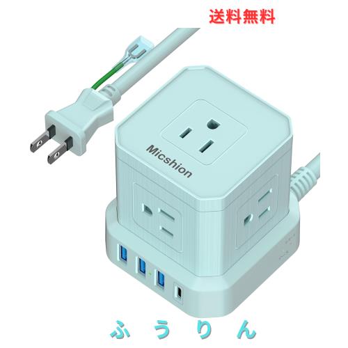 Micshion キューブ型電源タップ(2400W) Type-C付 延長コード 2m コンセントusb付き 雷ガード 5個AC口 3個USBポート 1個Type-C 電源タッ