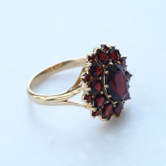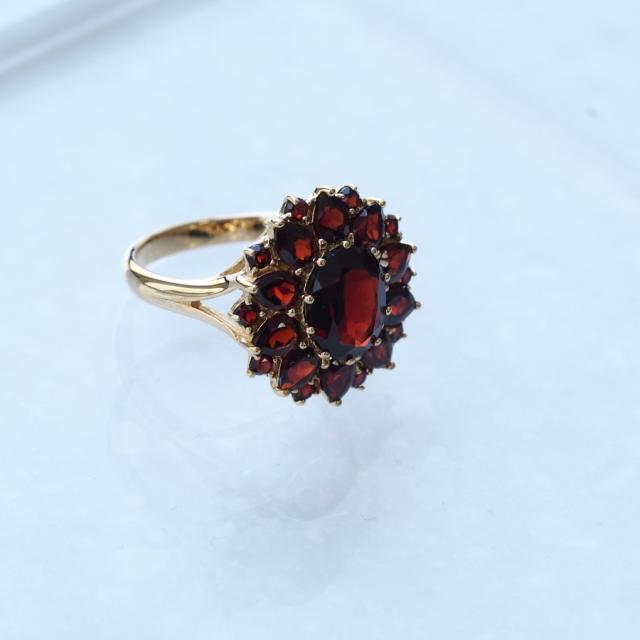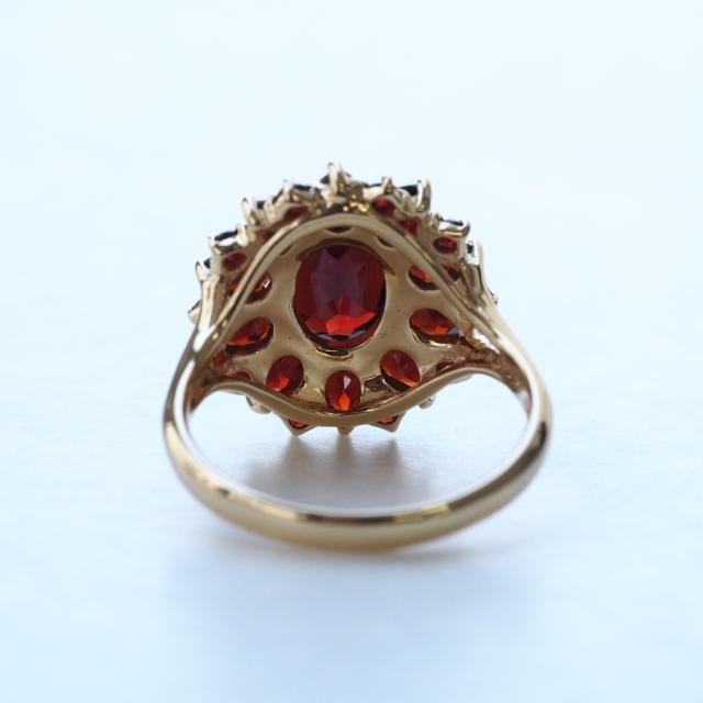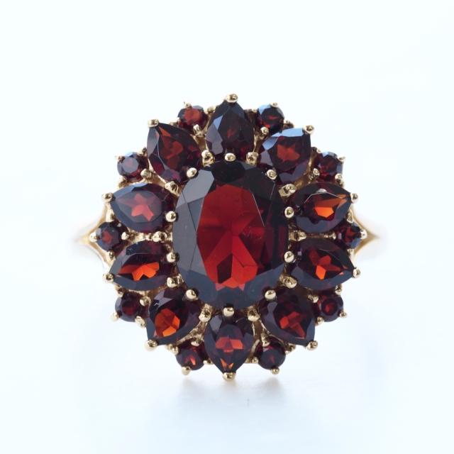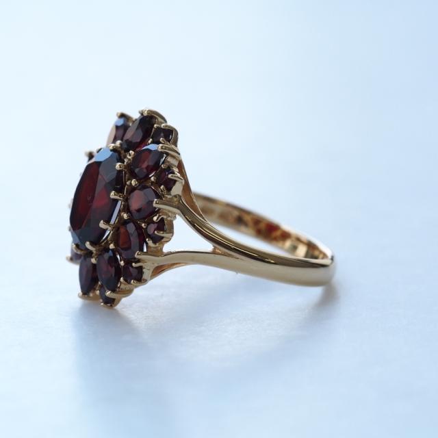 中心のガーネットをペアシェイプとラウンドシェイプで2重に取り巻いた華やかなデザインのリングです。