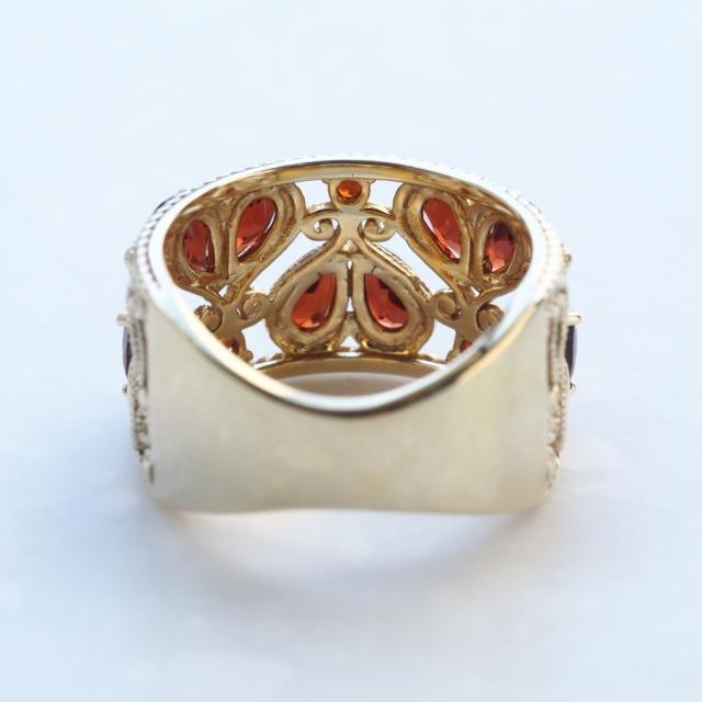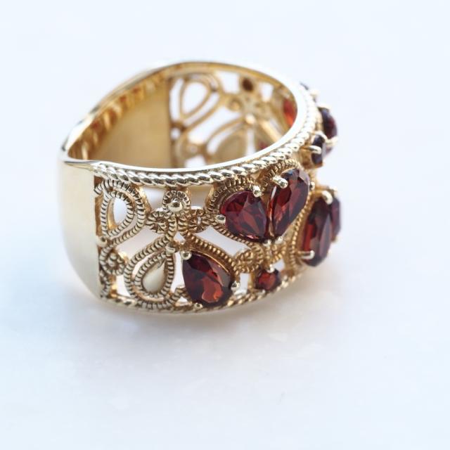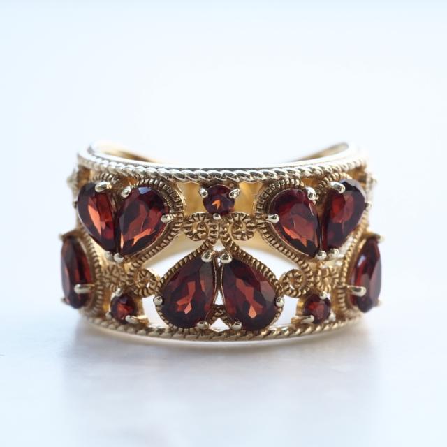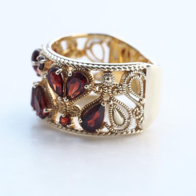 ハートをかたどったカンティーユスタイルのオープンワークにガーネットをセッティングした幅広タイプ(バンドタイプ)のリングです。