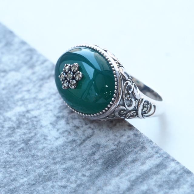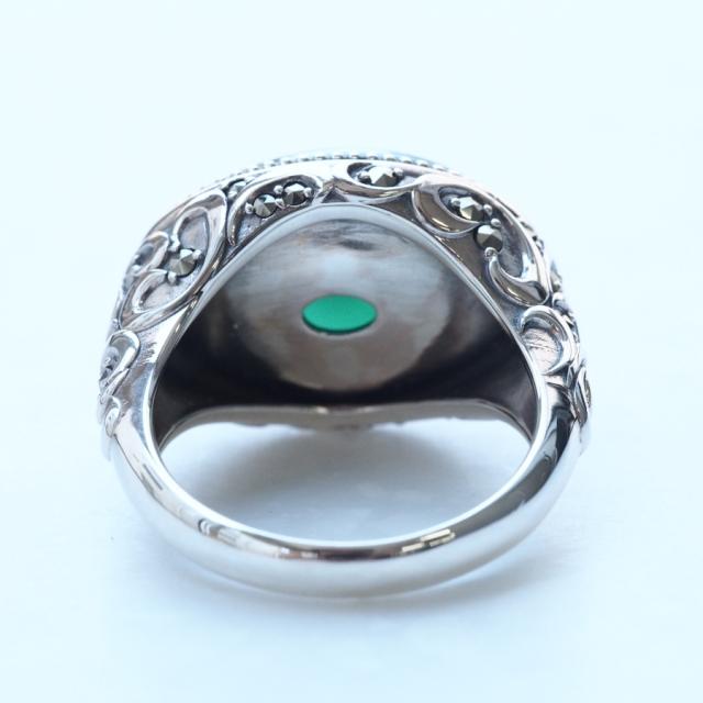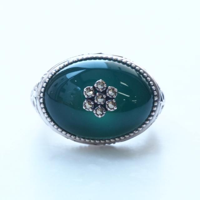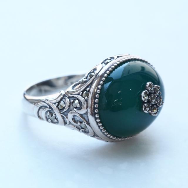 グリーンカラーのまろやかな色彩が素敵なアゲートと流れるように美しいアラベスク文様、合間にきらめくマーカサイトのハーモニーが一体となって迫力のあるリング。