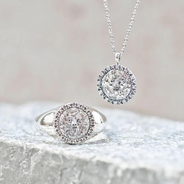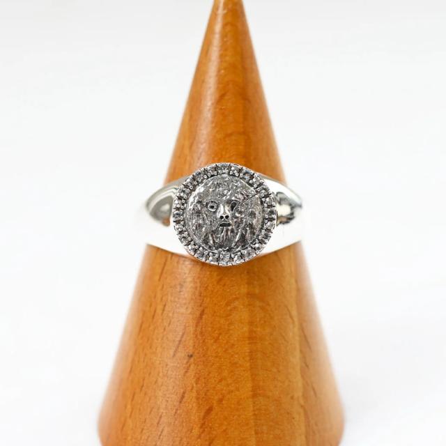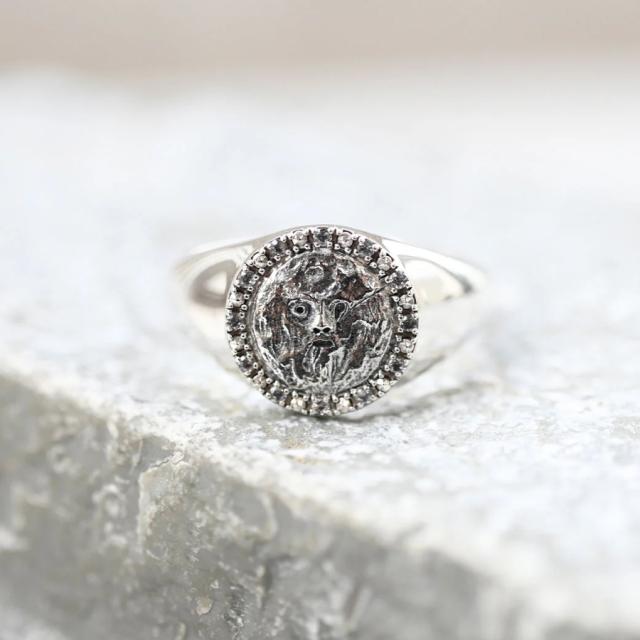 直径11mmのコイン型モチーフには、その神秘的な表情が繊細に表現され、周囲に留められたホワイトトパーズが上品な輝きを添えています。指になじむ丸みを帯びたフォルムで、ストレスフリーな着け心地も魅力。