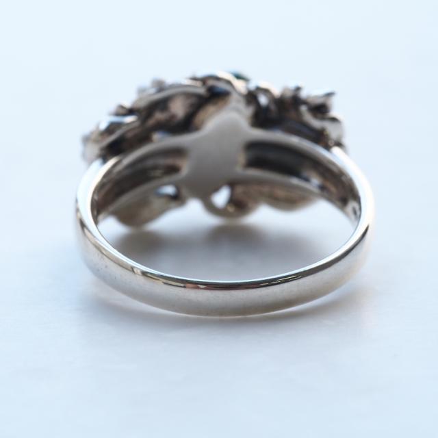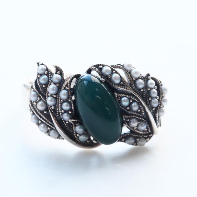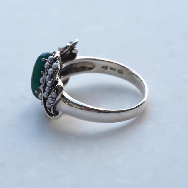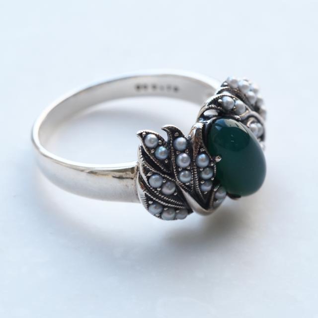 深みのあるグリーンアゲートをふんわりと草木が包み込むようなロマンチックなリングです。