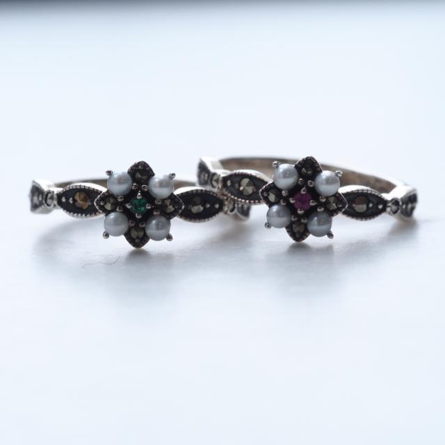 貴石のルビーとエメラルドをマーカサイトとシードパールで取り巻いた2本セットの贅沢なリングです。
