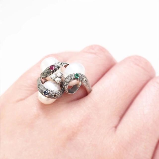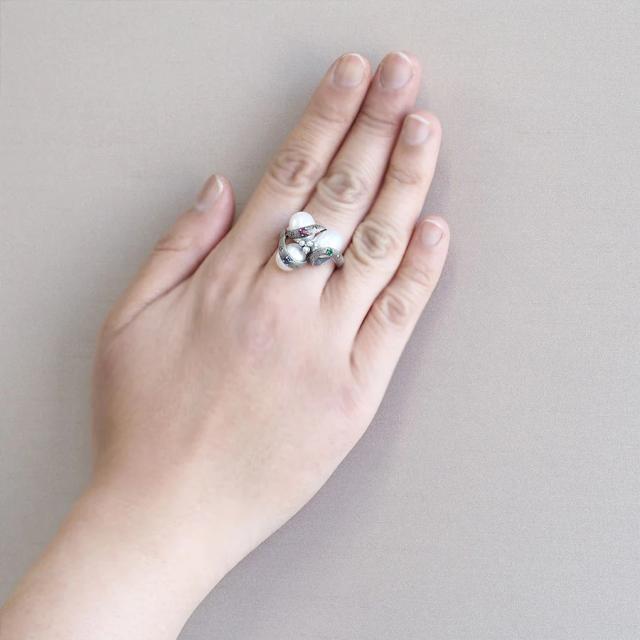 パールの丸みに沿って繊細なテクスチャーとカラーストーン(ルビー/サファイア/エメラルド)、マルカジットをセッティングした手の込んだつくりで立体感の中にもしっかりと職人技を巧みに盛り込んでいます。