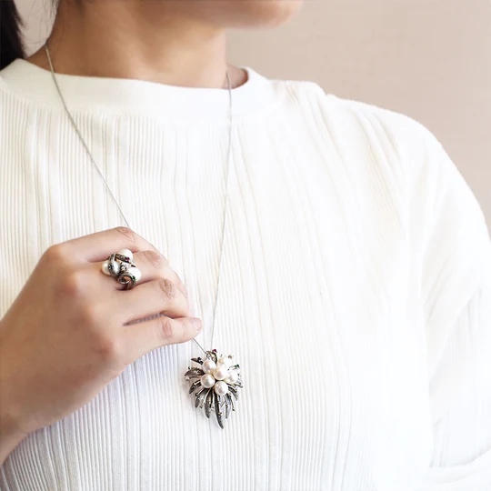 アンティークの世界で愛された小さなシードパールを小花のように合わせ、大小のパールのコントラストが上品で繊細な雰囲気を高めています。