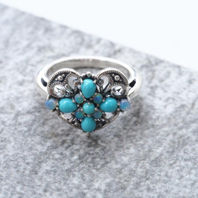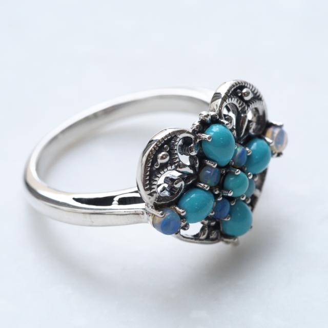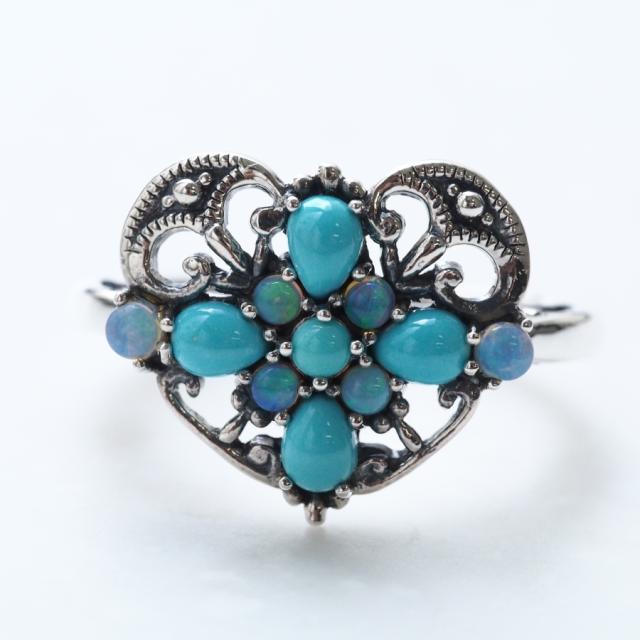 ハートモチーフの枠にターコイズとオパールを留めたさわやかで可憐なリング。