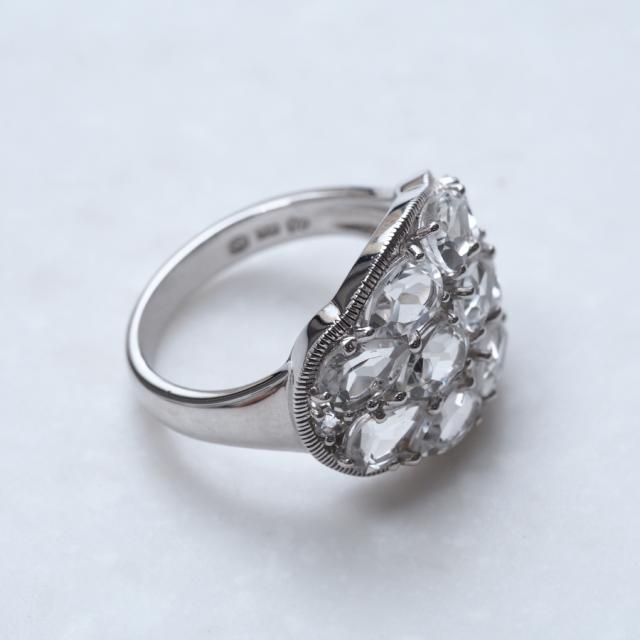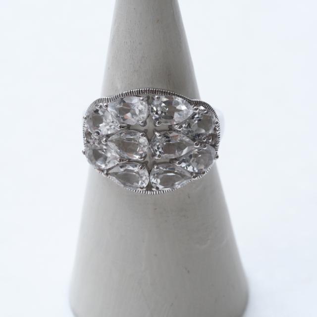 横長のシルバー枠にドロップ型のホワイトトパーズを隙間なく敷き詰めました。