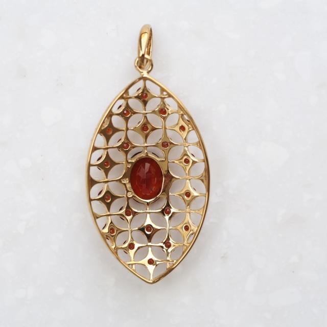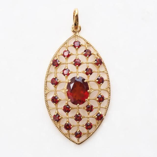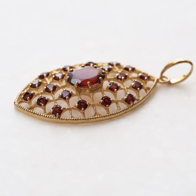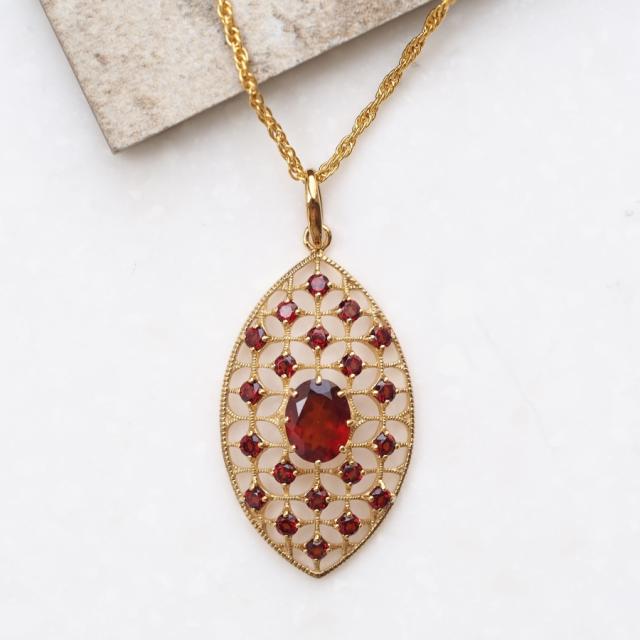 赤いガーネットにコニャックカラーをプラスしたような、こくのある色彩が魅力のヘソナイトガーネットがポイントのペンダントです。上品な深みのあるコニャックレッドにとろみを感じる質感が美しい宝石です。